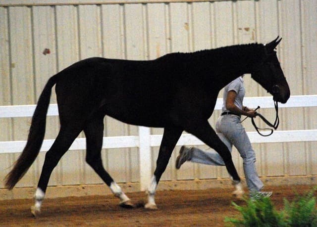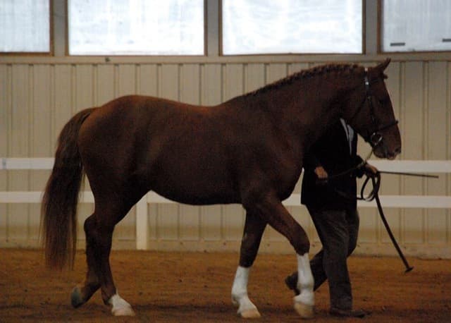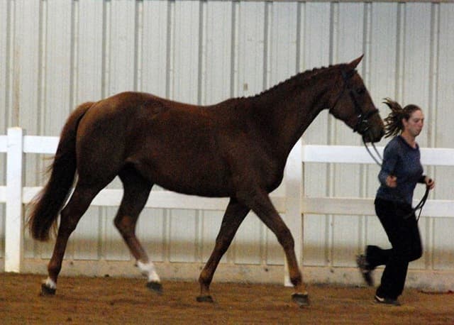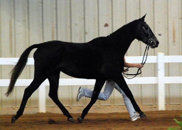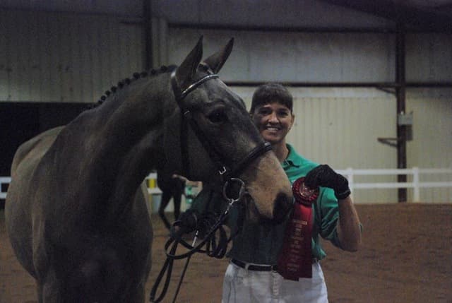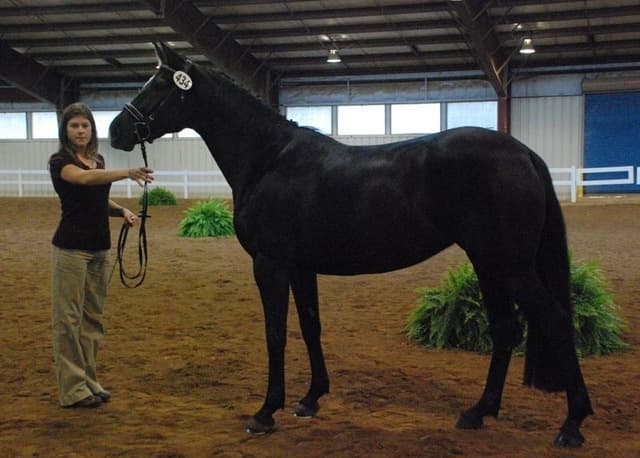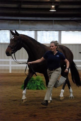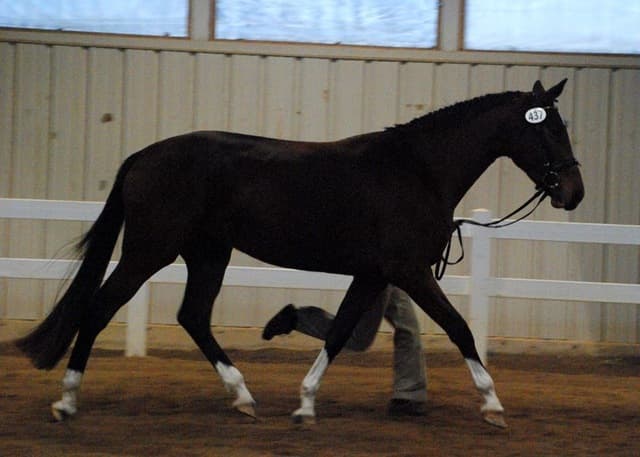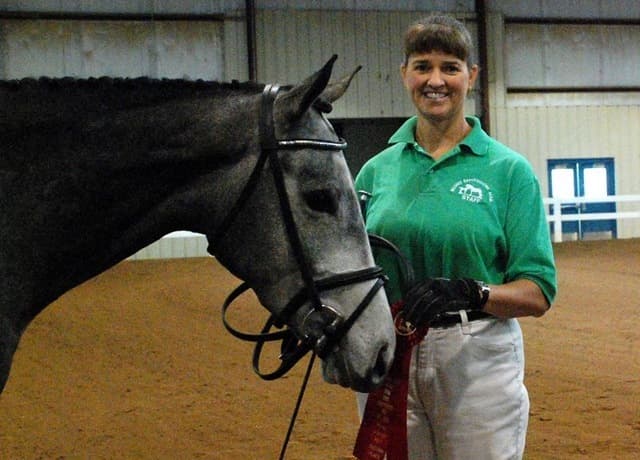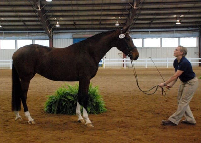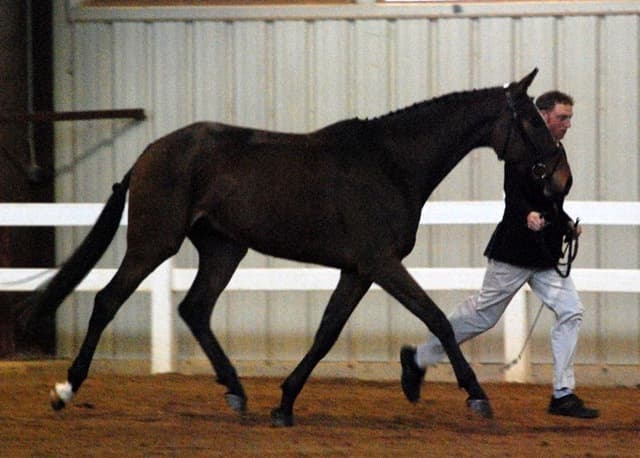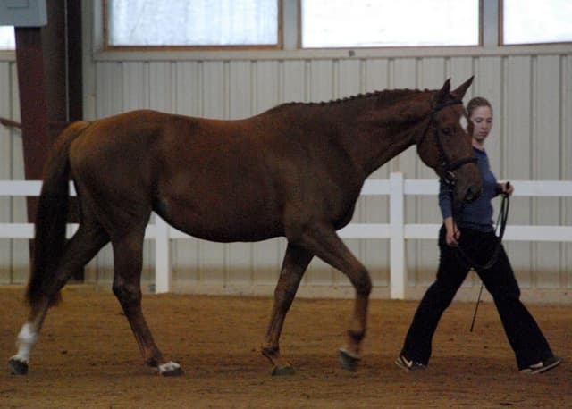 The three-year-old Oldenburgs dominated the competition, with Royal Tribute taking the win in the Three-Year-Old Colt/Gelding Championships, the Three-Year-Old Overall Championships, and the Overall Grand Championship. The leggy Oldenburg gelding (Royal Prince—Firstar) is owned by Kristen Burgers and scored a commendable 77.35. Though Lauren Seitz’s Oldenburg filly Just About Perfect scored higher in her Three-Year-Old division (taking the win with a 78.65), she had to settle for Reserve Three-Year-Old Overall Champion and Reserve Overall Grand Champion of the show. Emily Daily photos. (Left: Royal Tribute & handler Doug Payne accept their ribbons from judge Susan Graham White.)