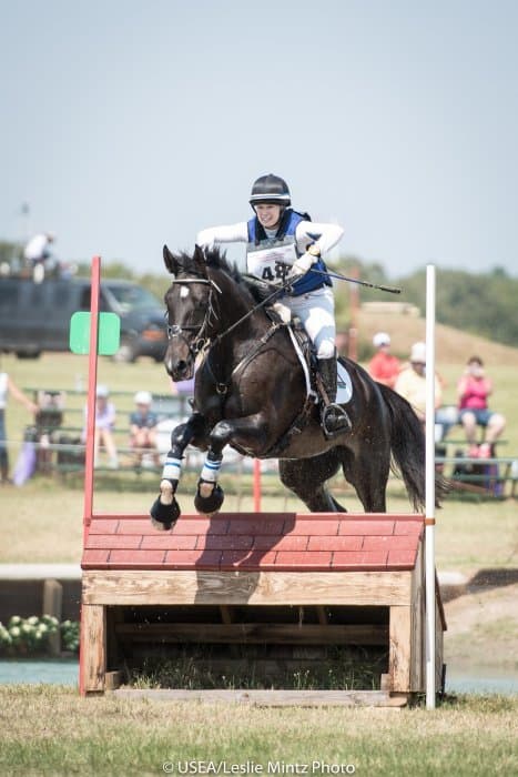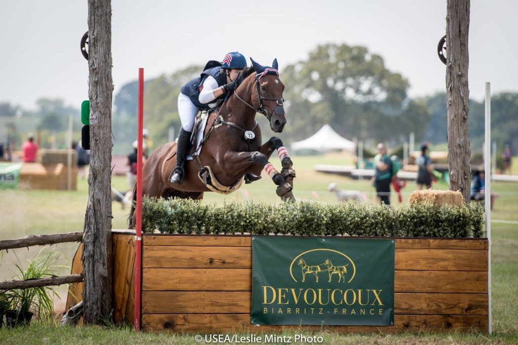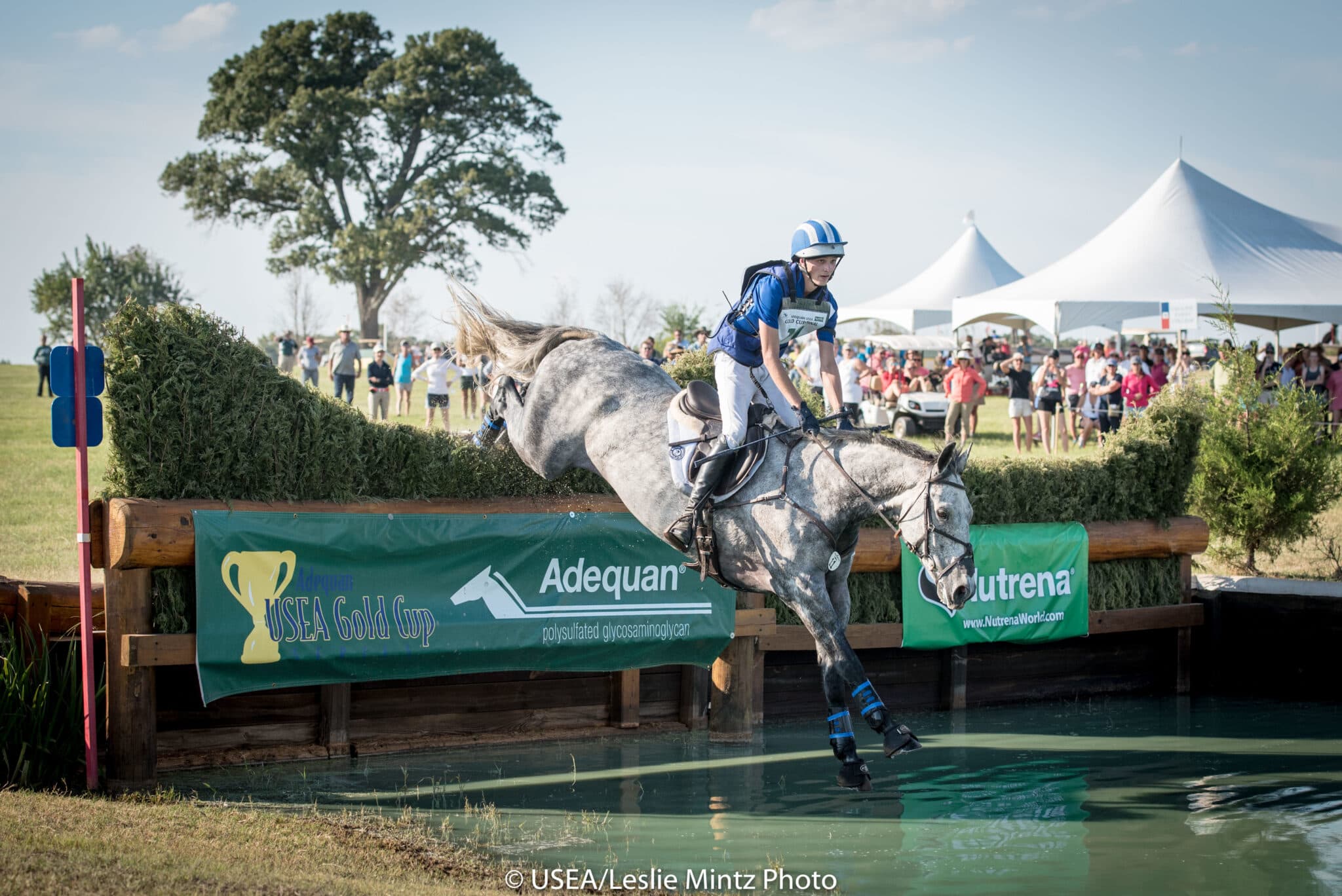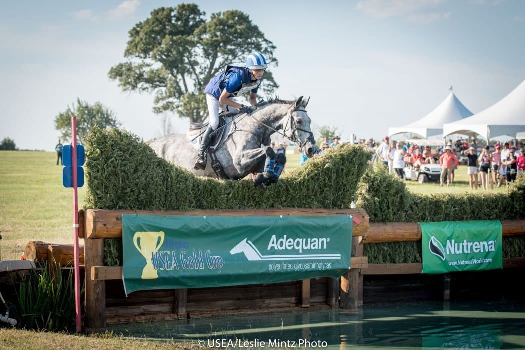 The upper levels headed out on the cross-country today to tackle Captain Mark Phillips’ course at the Nutrena American Eventing Championships presented by VTO Saddlery, and the standings in the Adequan USEA Gold Cup Final have been shaken up a bit from dressage. In the end it all came down to time penalties which determined the overnight standings. Jacob Fletcher added only 4 time penalties to his dressage score to remain in the lead aboard Atlantic Domino, a 10-year-old Irish Sport Horse owned by Company Fletcher Farms. “He was good today! He developed a bit of a left drift a few times, but he’s such an honest horse and a really beautiful jumper. He backed off to a lot of the fences, which allowed me to not pull as much so I shaved off a few seconds there,” Fletcher explains. Looking forward to tomorrow’s show jumping Fletcher comments that if he halfway does his job that Atlantic Domino should jump clear.