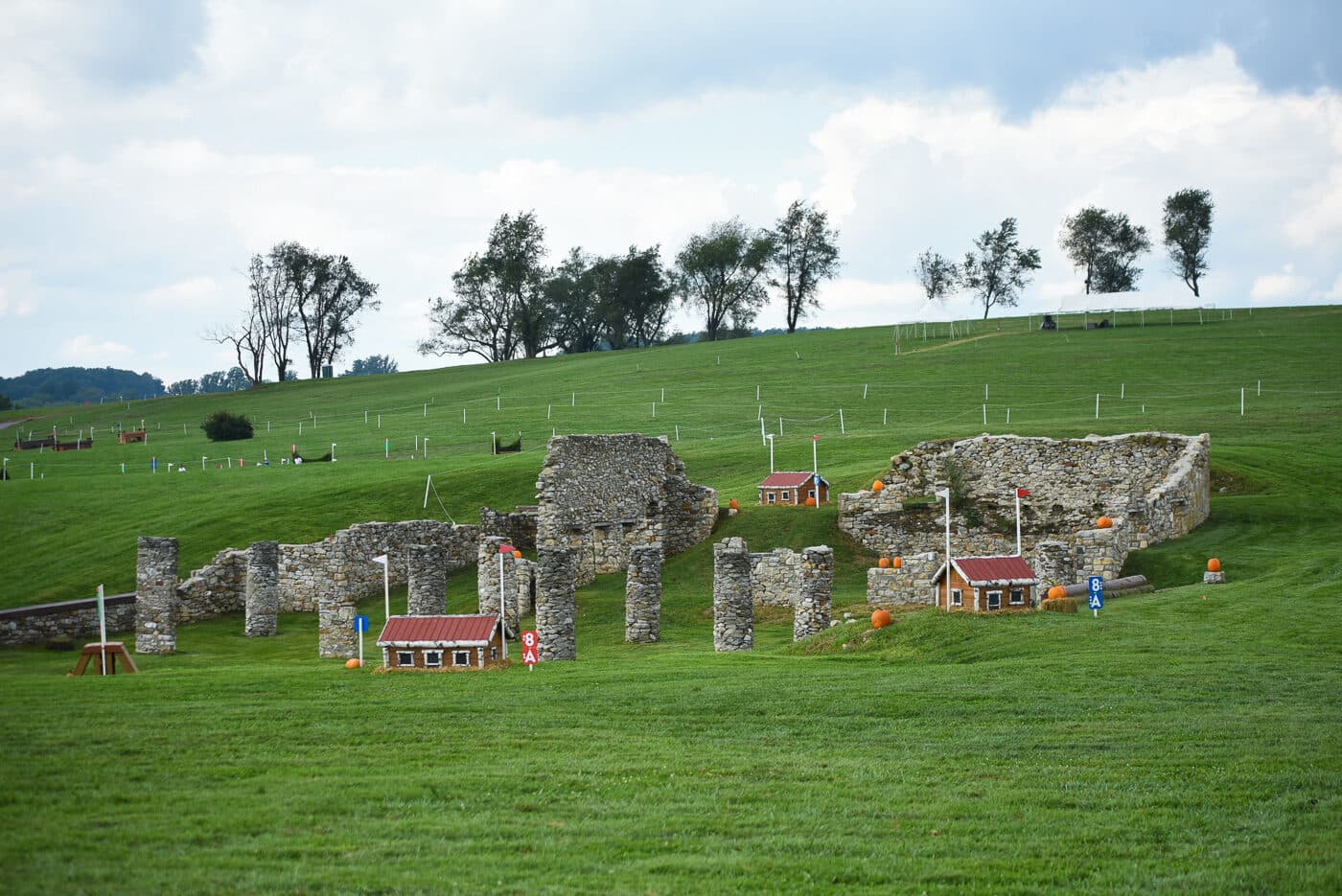 Horses will jump down into the ruins over the first cabin before making a sharp turn around the pillars and climbing up a steep slope to the second cabin. USEA/Jessica Duffy Photo.