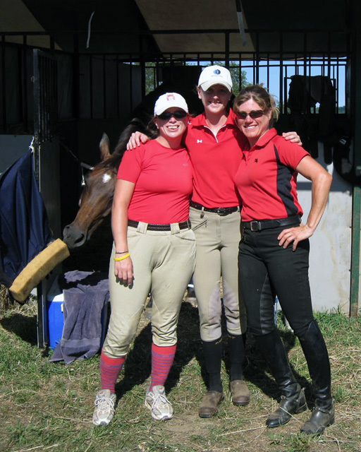 (The Area II contingent of the “CDCTA Ladies in Red” after cross-country. Amanda Tamminga, Wendy Masemer, and Helen Hayn.)