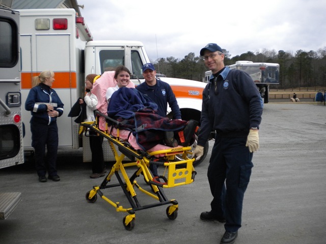 (Libby Head showed good spirits on her way to the hospital for a broken ankle.)