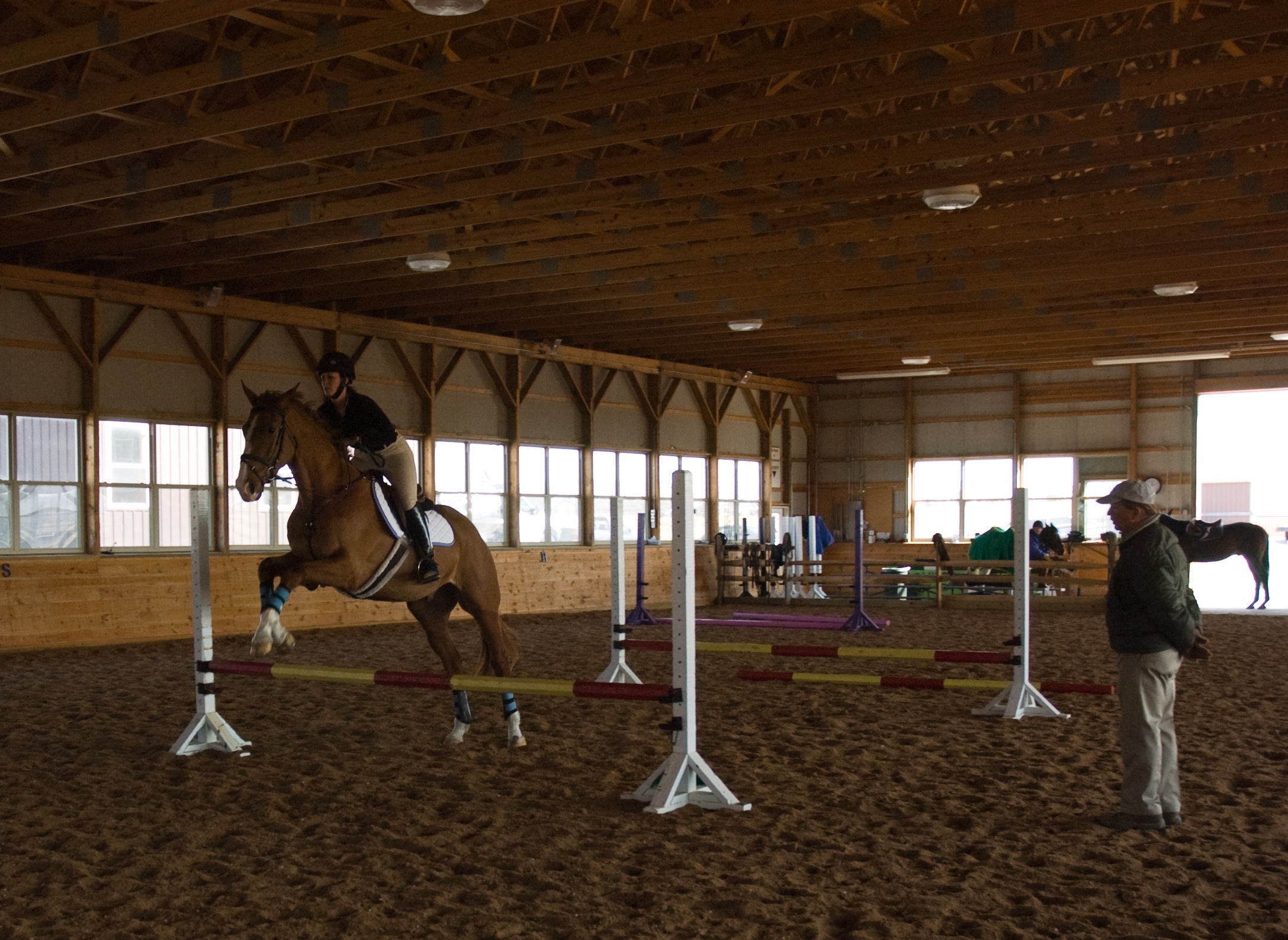 Our two lessons were not a high jump contest by any means. Even at this stage of his training, there is obviously a lot of scope and power with Prince; but he needs to learn where his legs are and his footwork first so that we have hope of harnessing that power. Being young and big (about 17 hands and 4 years old), I do not want to be pounding on his legs. But Prince likes a challenge and Jimmy's lessons challenged his brain not his body. In both lessons, we worked up to jumping from a SLOW trot over a placing pole, 9' to a small vertical, 18' to another vertical, 19' to another vertical. Prince made some mistakes as he sorted out how to fit his body and one stride in the little grid but he didn't make the same mistake twice. He was very bold, willing and improved with each lesson, which is the most I can expect from him at this point (I can't wait to see what he is doing after some consistent work!).