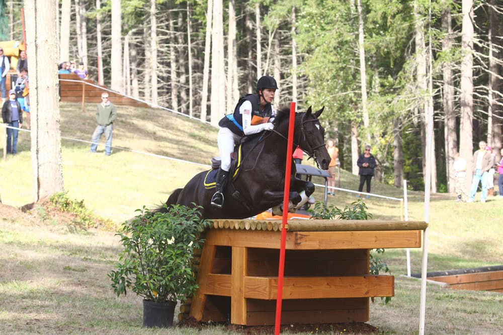 Late this afternoon, hundreds of spectators gathered to watch the Adequan USEA Gold Cup division run cross-country at Aspen Farms Horse Trials (AFHT) in Yelm, Washington. Mary Burke and her own Thoroughbred gelding Prince William held their overnight lead, maintaining a score of 35.6.