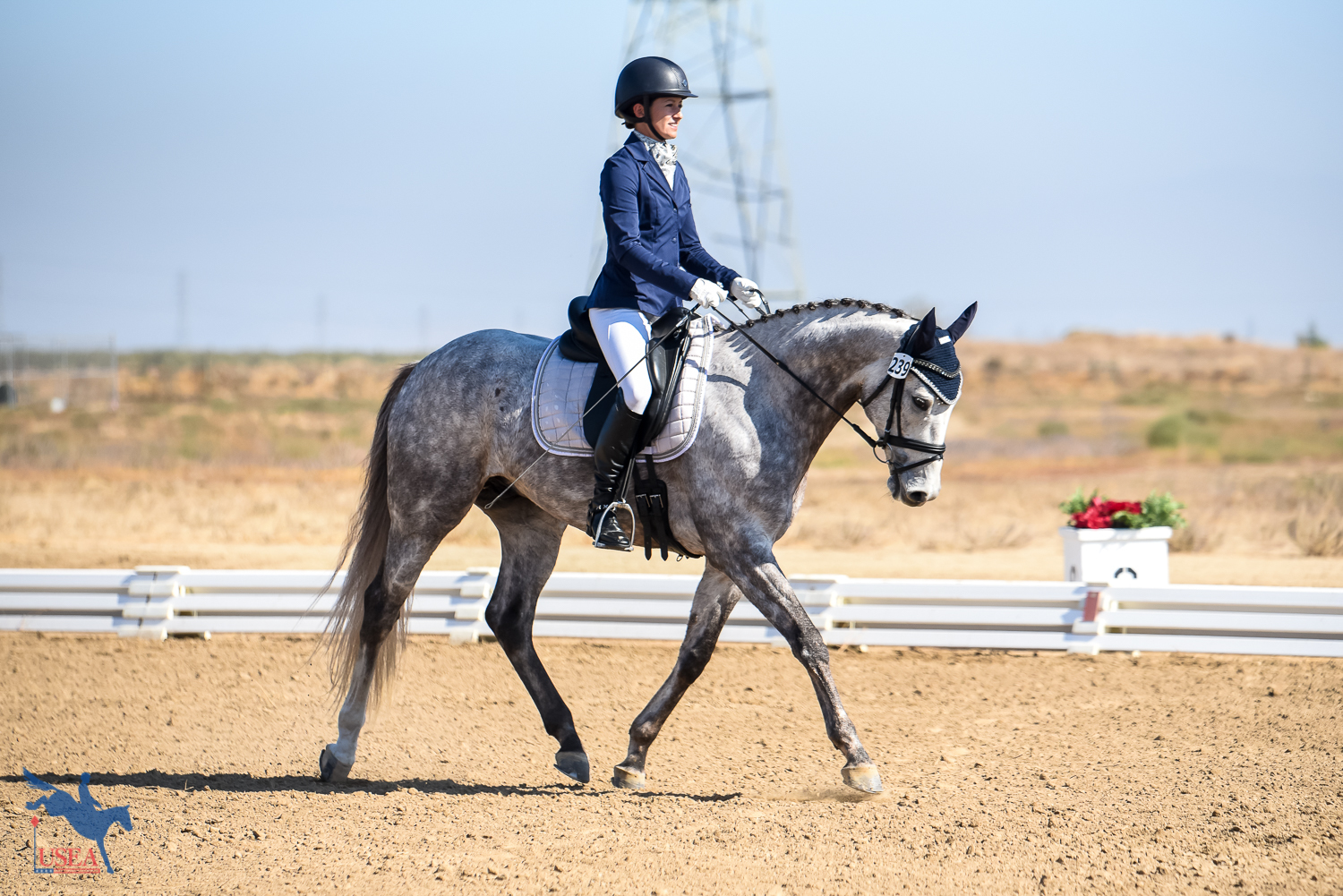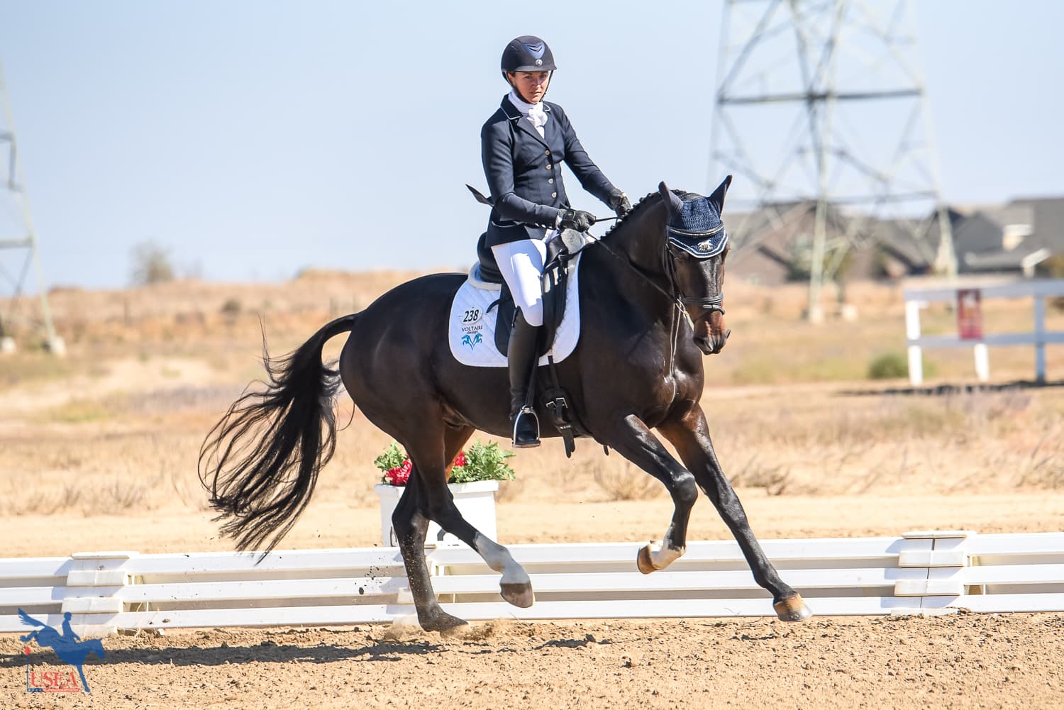 “I got him on New Year’s Day – he had just turned four,” recalled Hartenburg, “At the time I was living in Colorado – my husband is in the Air Force – and the night that I got [Mucho Me Gusto] home I found out we were being stationed in California, so our life kind of got turned upside down.” Hartenburg used the time spent moving to let him down and then started him back up in May of last year, competing in the YEH 4-year-old classes last year and then the 5-year-old classes this year, in addition to some shows at the Training level.