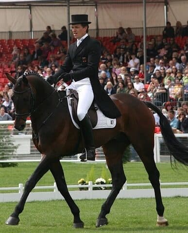 Kai Rüder, of Germany, and his stallion Le Prince des Bois hold an impressive lead at the close of dressage at the Mitsubishi Motors Badminton Horse Trials. Rüder, 39, has a 5.8-penalty lead over the first day leader Ruth Edge, of Great Britain, on Two Thyme, who took the early lead with a 39.0 on Friday. Full Results Jan Milne Photo.