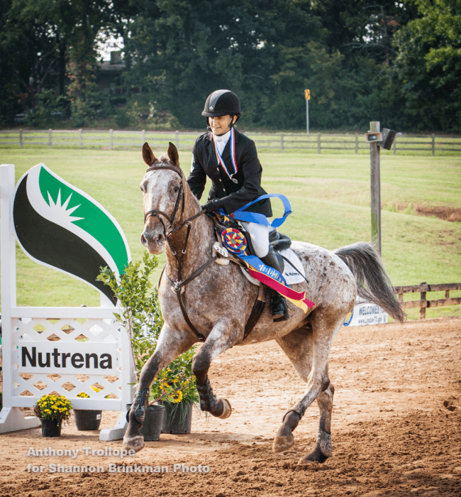 Thirteen-year-old Maddalyn Hunt from The Woodlands, Texas, won the Broadstone Beginner Novice 14 and Under division aboard a horse that she found for sale online.