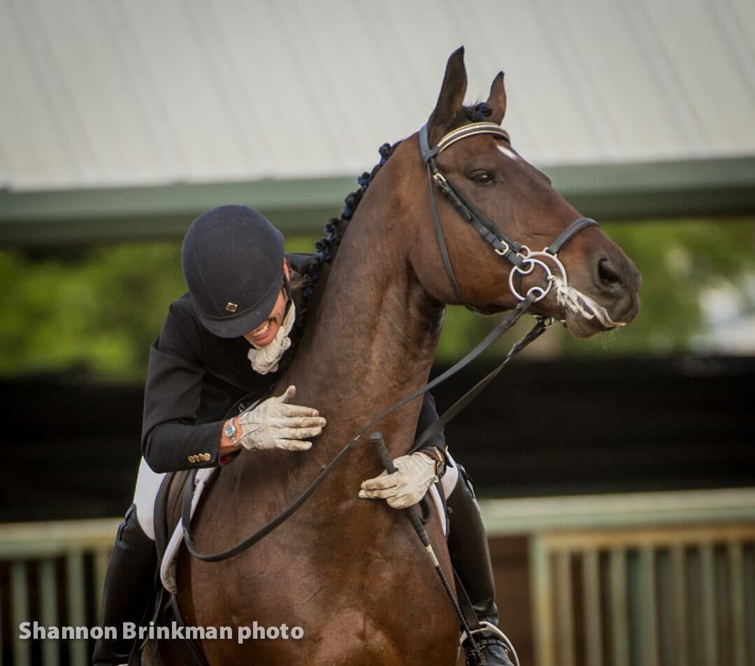 Kristen Hardy had some help from an angel today, winning a huge Senior Novice Amateur division aboard Enchanted (Double Cream – Willma) on her dressage score of 27.5. Hardy rode with a purple streak in Enchanted’s tail in memory of Avery Dudasch; the team from Platinum Farms (Franktown, Colo.) and Dudasch’s mother, Vicki, stood ringside to cheer her on.
