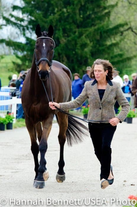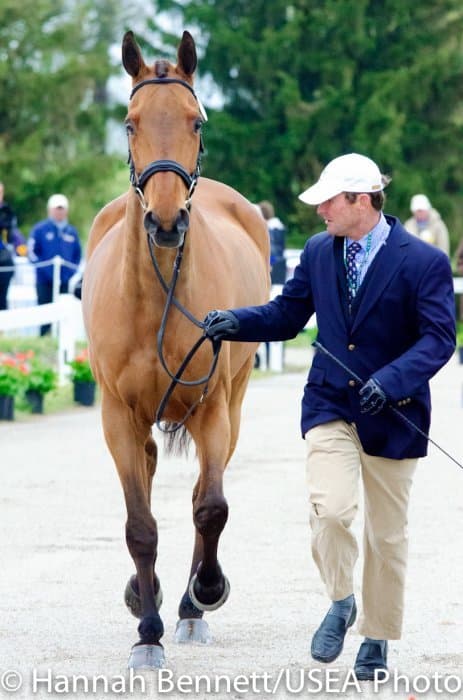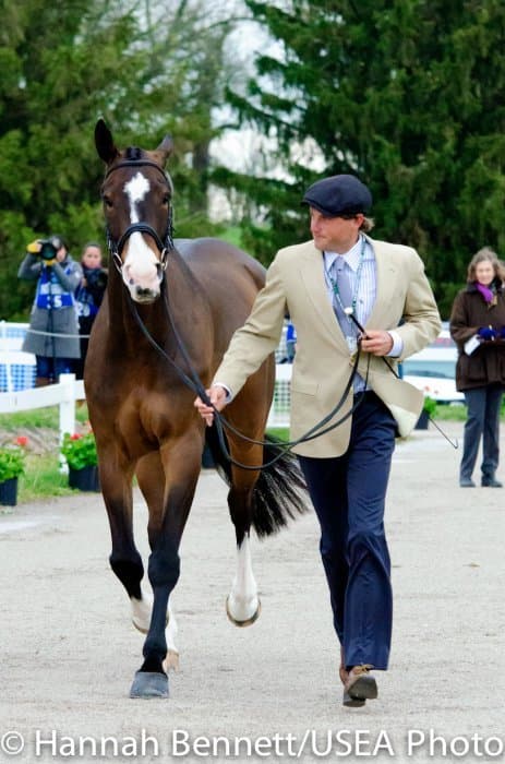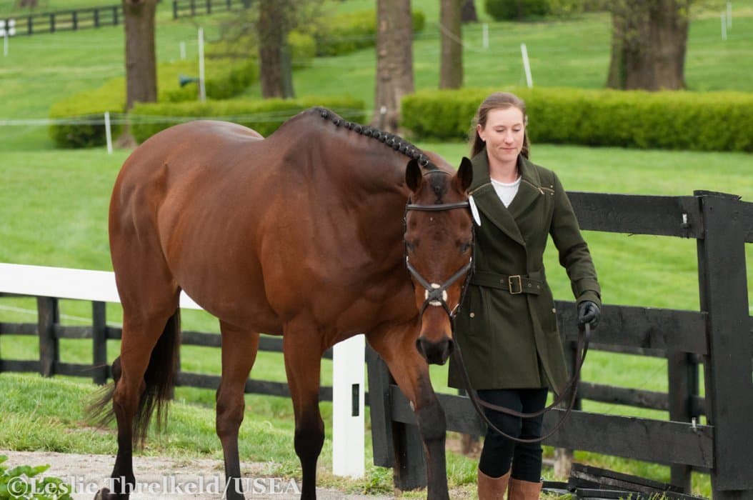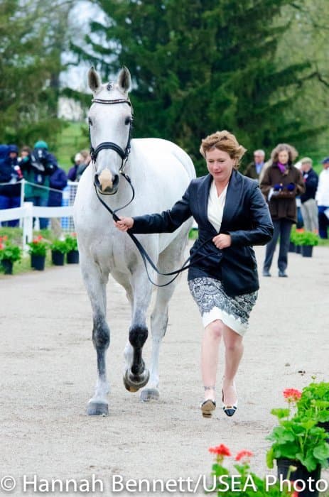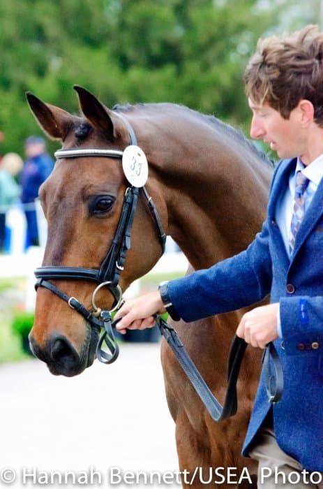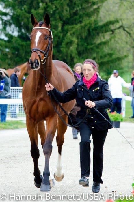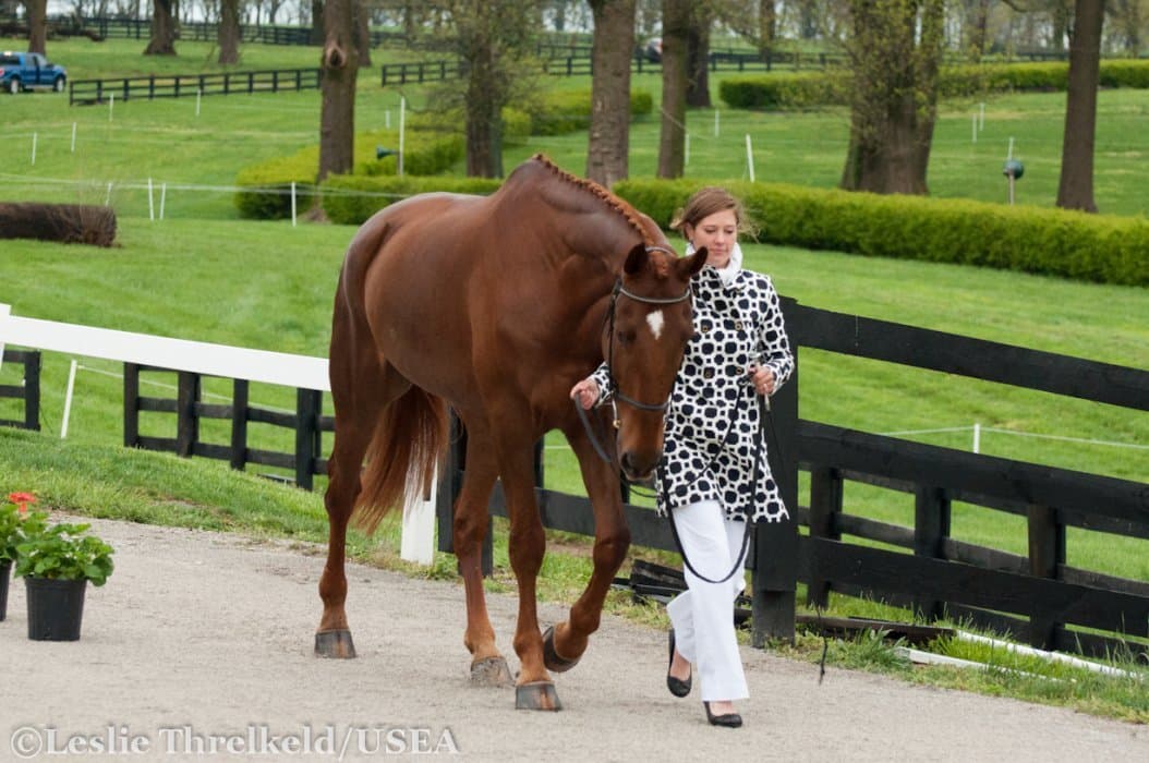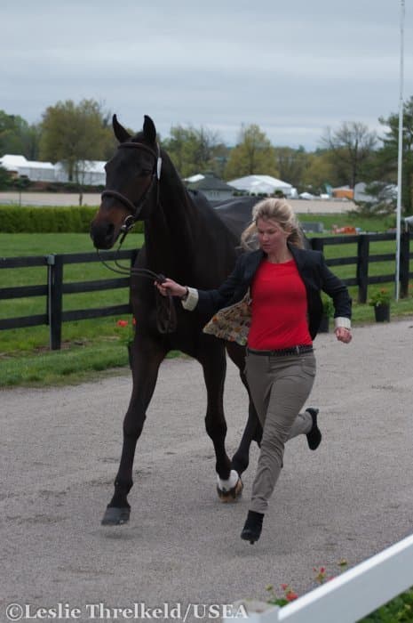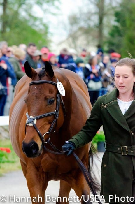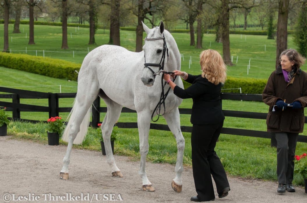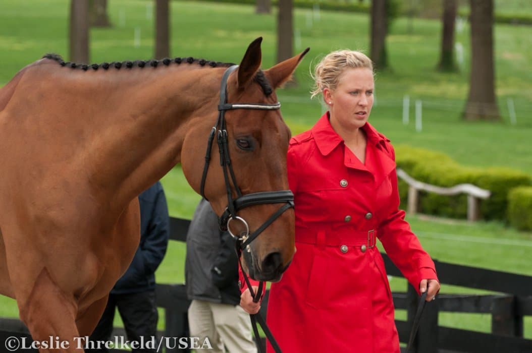 Heavy rains saturated the Kentucky Horse Park this morning, and though the downpour subsided by the start of the First Horse Inspection at 3:00 p.m., the temperature had dropped significantly. The horses were feeling fresh, and many seemed ready to charge out of the startbox. Several horses struggled to stand quietly for the Ground Jury, and the crowd of photographers at the end of the jog lane gave others a good excuse to spook. Nevertheless, horses and riders were spectacularly turned out and looked fit and ready for the week.