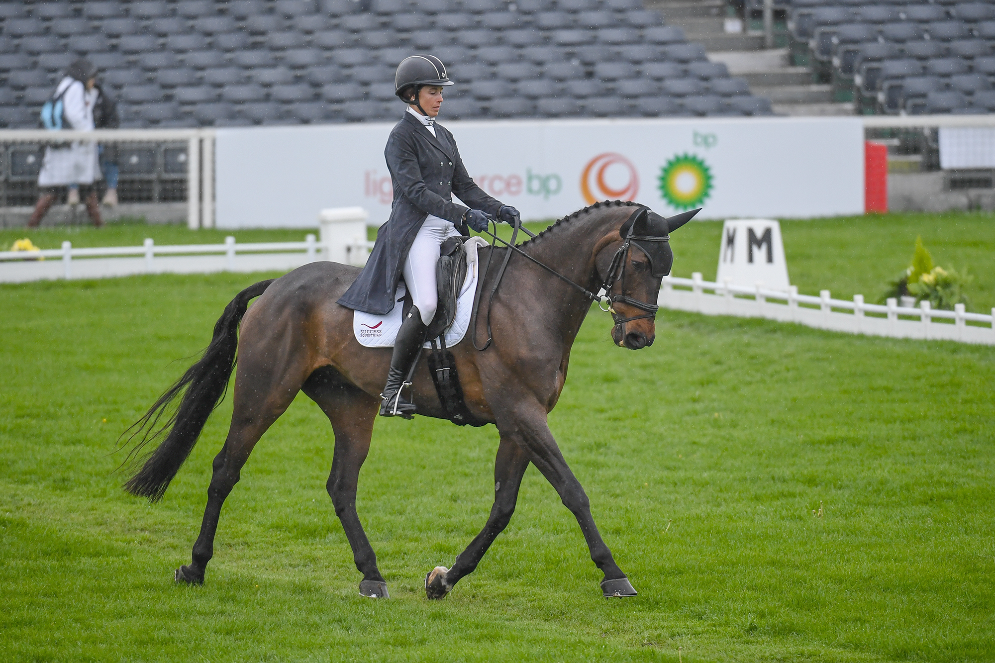 South Gloucestershire, England—May 6—Rosalind Canter and her hugely popular horse Lordships Graffalo lit up a damp Coronation Day when producing a superb dressage test to take the lead at Badminton Horse Trials.