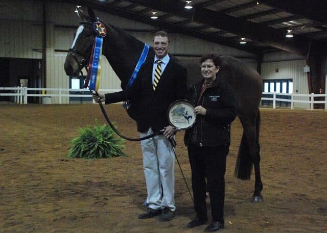 Royal Tribute, a three-year-old Hanoverian/Thoroughbred gelding (Royal Prince—Firstar), was crowned Grand Champion of the 2009 IDHSNA/USEA Future Event Horse East Coast Finals last Friday at the Virginia Horse Center in Lexington, Virginia by judges Carter Bass (pictured with handler Doug Payne) and Susan Graham White. Owned by Kristen Burgers, the striking youngster also won the Three-Year-Old Colts/Gelding class and the Three-Year-Old Championship, scoring a fantastic 77.35. Complete results. Emily Daily photo.