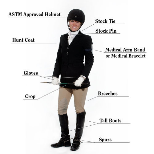 Light-weight clothing is appropriate for this Test, a shirt (any color) with sleeves must be worn. Protective Headgear in accordance with paragraph 1 above. This headgear may be any color. Britches or jodhpurs may be any color; Gloves (if worn) may be any color; Boots—black, brown, field, jodhpur or a black or brown full grain smooth leather leg piece and matching leather boots. Chaps or half-chaps are not allowed.