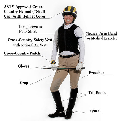 8. At Eventing Tests or at any level when all three phases of a Horse Trials are contested over one day - Protective headgear and protective vests as above. Clothing as appropriate for the test in progress (see below), or at the competitor’s option - boots, britches, spurs and gloves - as applicable for the test being performed. Long or short sleeved shirt with collar and without neckwear, of a conservative color, neatly tucked into riding breeches.