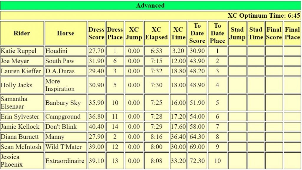 Three Advanced competitors withdrew before the cross-country phase, Anita Gilmour and RF Fantastique (9th), Kristen Rozycki and Full Circle (4th), and Rachel McDonough and Irish Rhythm (8th).