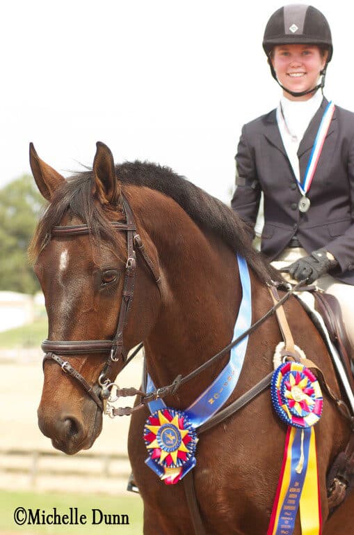 Heather Morris, of Lewisville, Texas didn’t have to travel far to win a Champion title in the Training Horse division. She rode Elizabeth Radar’s Russell to a win after adding nothing to their dressage score of 30.0. Beau Guimond had been leading the division until the show jumping, where he and Filibuster ST dropped an unlucky rail. They finished second.