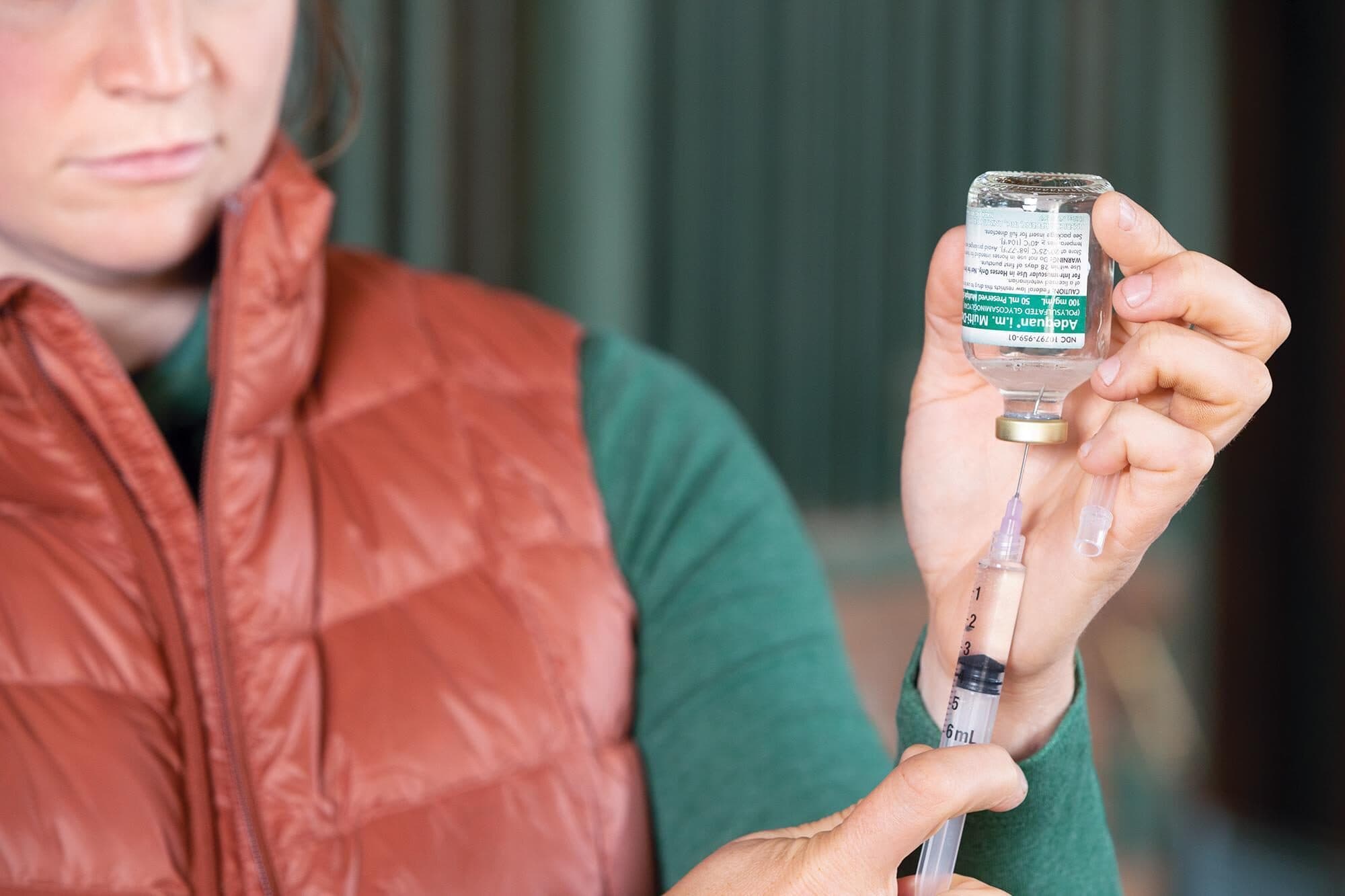 BRIEF SUMMARY: Prior to use please consult the product insert, a summary of which follows: CAUTION: Federal law restricts this drug to use by or on the order of a licensed veterinarian. INDICATIONS: Adequan® i.m. (polysulfated glycosaminoglycan) is recommended for the intramuscular treatment of non-infectious degenerative and/or traumatic joint dysfunction and associated lameness of the carpal and hock joints in horses. CONTRAINDICATIONS: There are no known contraindications to the use of intramuscular Polysulfated Glycosaminoglycan. WARNINGS: Do not use in horses intended for human consumption. Not for use in humans. Keep this and all medications out of the reach of children. PRECAUTIONS: The safe use of Adequan® i.m. in horses used for breeding purposes, during pregnancy, or in lactating mares has not been evaluated. For customer care, or to obtain product information, visit www.adequan.com. To report an adverse event, please contact American Regent Animal Health, Inc. at 1-888-354-4857 or email [email protected].