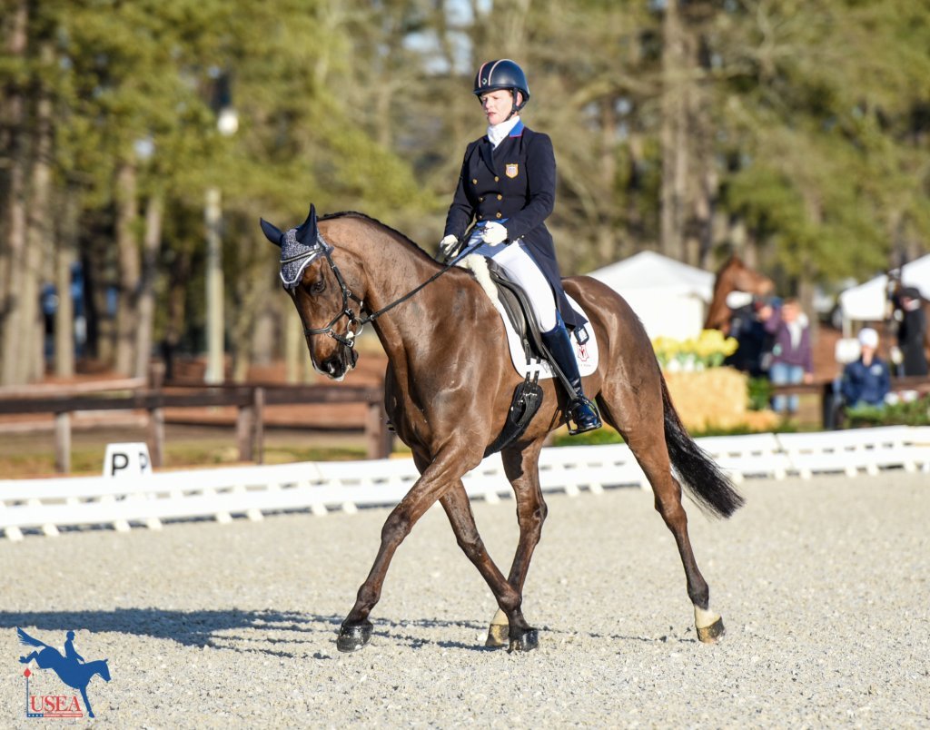 There wasn’t quite enough time to fit all Adequan USEA Gold Cup CIC3* dressage rides into one day, so the final eight riders took their turn in the sandbox this morning. Luckily the schedule worked for Kim Severson who got stuck in the snowstorm that hit Virginia on Wednesday. “We kept not knowing what the weather was going to do,” explained Severson. “I was really hoping to get out on Wednesday, but we got 6 inches of snow on Wednesday night. So, [the horses] got a nice day off on Wednesday and we drove up on Thursday.”