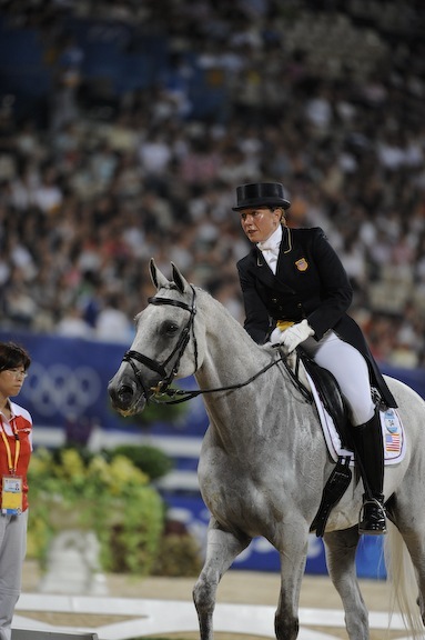 The morning set finished by 10:00 and the heat was just starting to make us melt again with a show of sunshine. The next set started in the evening just when the sun had disappeared. Courageous Comet appeared unusually tense when he entered the grand arena and so he was not quite the relaxed horse he can be. Becky made a few passes in front of the TV camera to give him a chance to see this spooky thing. And so he entered the arena not quite on his game, but as the test progressed they just got more relaxed and disciplined. Becky and Comet’s scores kept increasing the entire time to push them up to second place individually and maintain our second place as a team, too.
