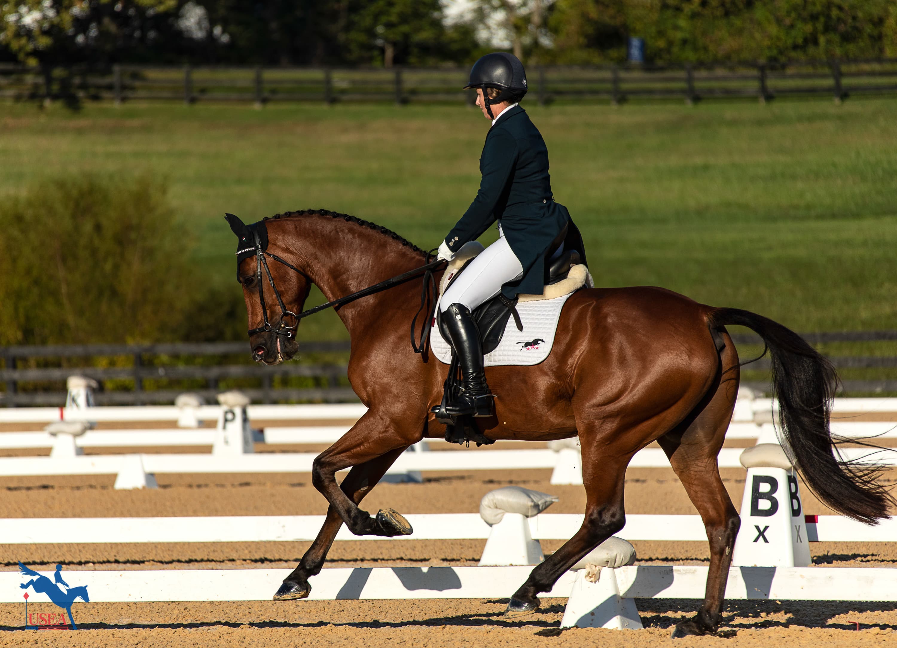 Capably keeping Claus’s emotions in check and his mind and body settled, White says she was overall very pleased with the morning’s ride. “I thought he was really good and steady the whole way, so I was thrilled with that. He nailed his halts and rein back, and it’s always nice when they do that. He’s got very good changes. His first change I thought was excellent. His second change wasn’t as on the mark, but for the whole, I thought he was just very consistent, which is really what I was going for with him so I’m really thrilled with that.”