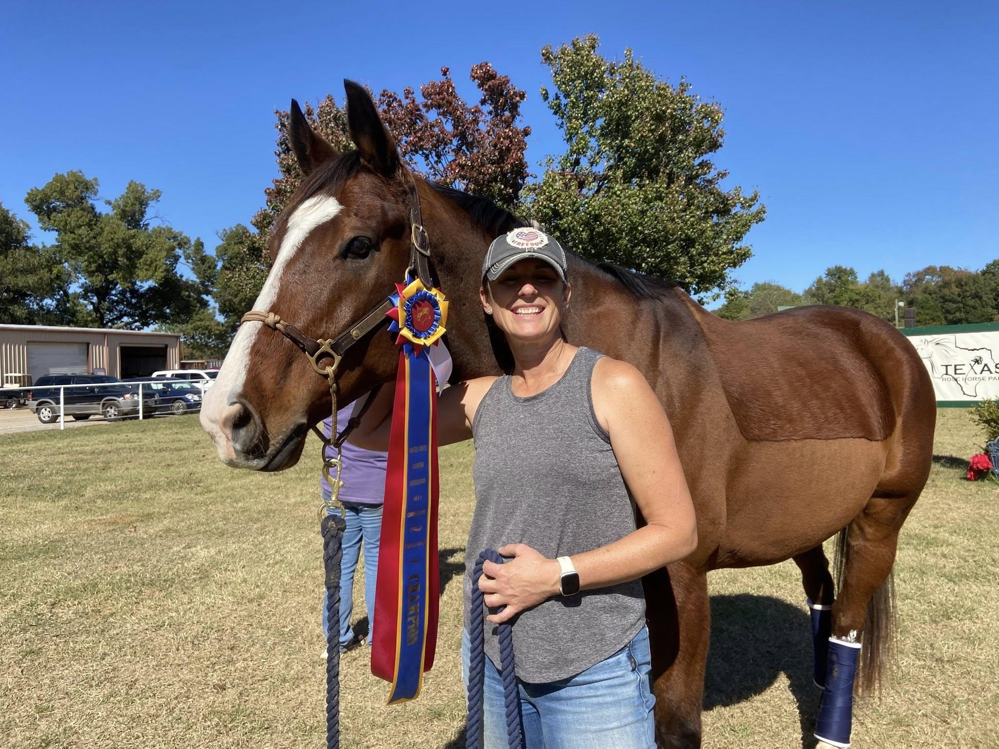 Katie Carney of Burleson, Texas, found her OTTB Talk of Texas (Saturday Launch x Make Change Indy), whom she lovingly calls Tater Tot, on a Craigslist ad in the summer of 2022.