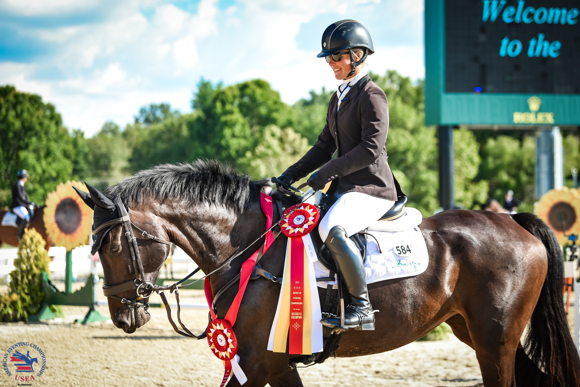 A double-clear round in the Rolex Arena saw Madeline Bletzacker (Galena, Ohio) move up one place to take the Novice Rider Championship on her own Danish Warmblood gelding Landtino S (Solos Lantinus x Chess S), “a failed dressage horse” but a former hunter derby winner, USEA Horse of the Year and now AEC Champion.