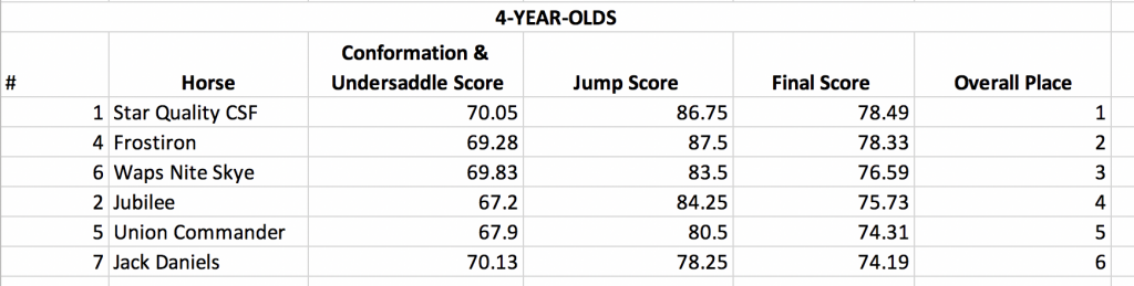The 4-year-olds were split by gender and ridden under saddle at the walk, trot, and canter before being stripped of tack and judged on conformation. They then showed off their gallop and jump in the jump chute with the same format as the 3-year-olds, but higher fences.