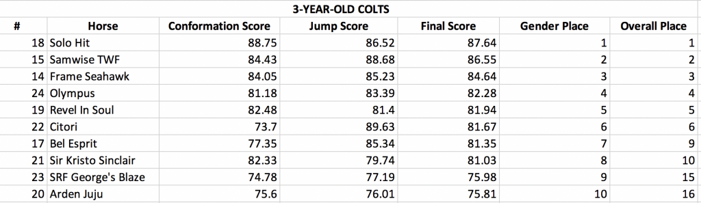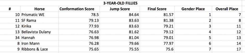 The top 3-year-old filly was Prismatic WE (Rabble Rouser x Report to Sloopy), a Thoroughbred cross owned by Kristin Carpenter, bred by Wits End Eventing and handled by Martin Douzant.