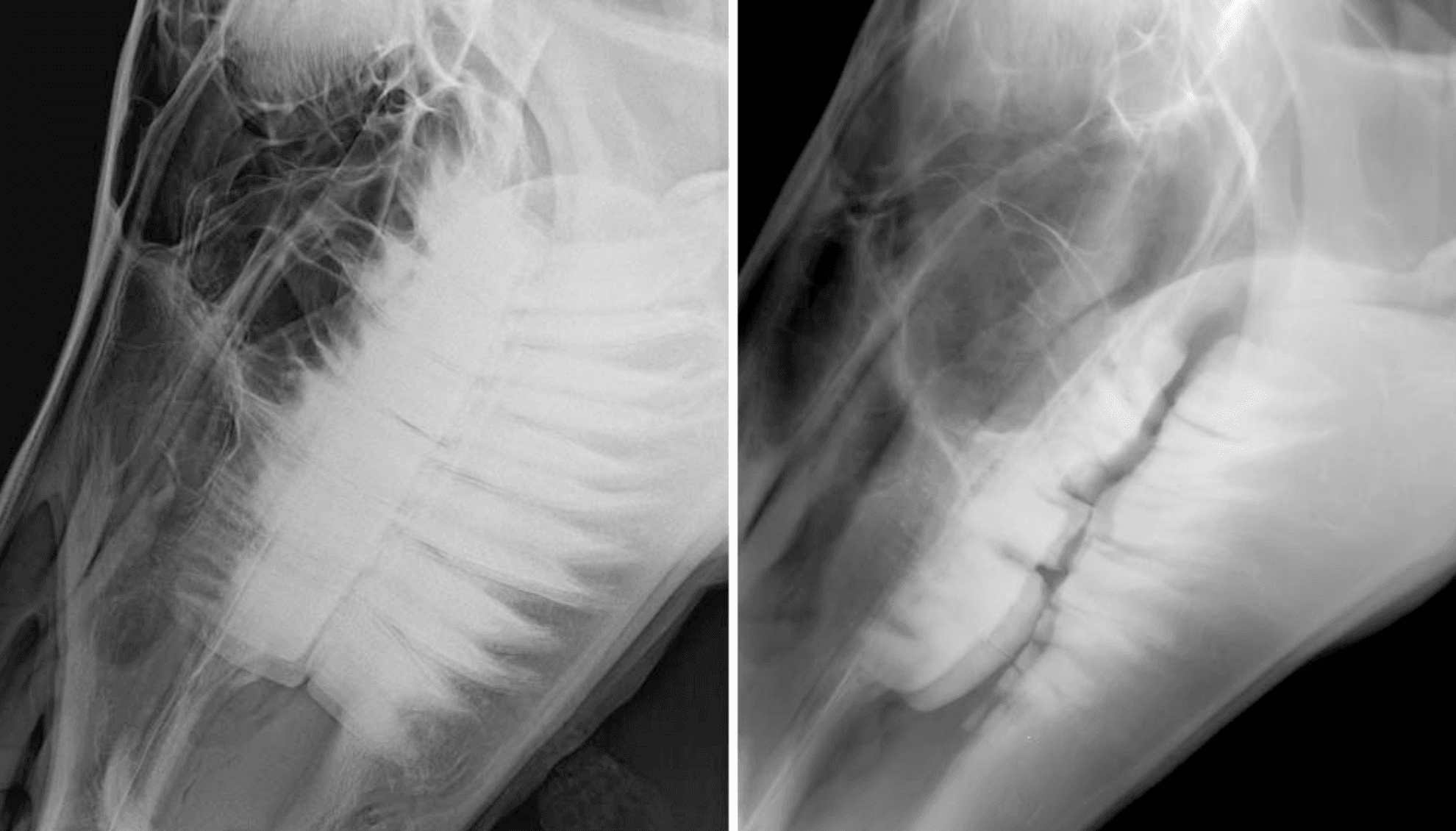Parrot mouth occurs when the mandible is sitting back behind and the maxillary incisors extend out over the mandibular incisors. “The horse develops a ramp and a hook, and usually the incisors don’t line up either, so you’ll get an overgrowth of one or both. You might say, ‘Well, what’s the problem with that?’ Eventually, the ramps will dig into the soft tissue. The problem with this kind of anatomy, this malocclusion, is that it prevents the normal rostral caudal movement of the mandible – sliding forward and back – with the flexion of the head. When you have a hook and a ramp and uneven incisors, that locks the jaw and usually transfers to temporomandibular pain.” Riders will notice that the horse resists the bit, especially when asked to flex at the poll.