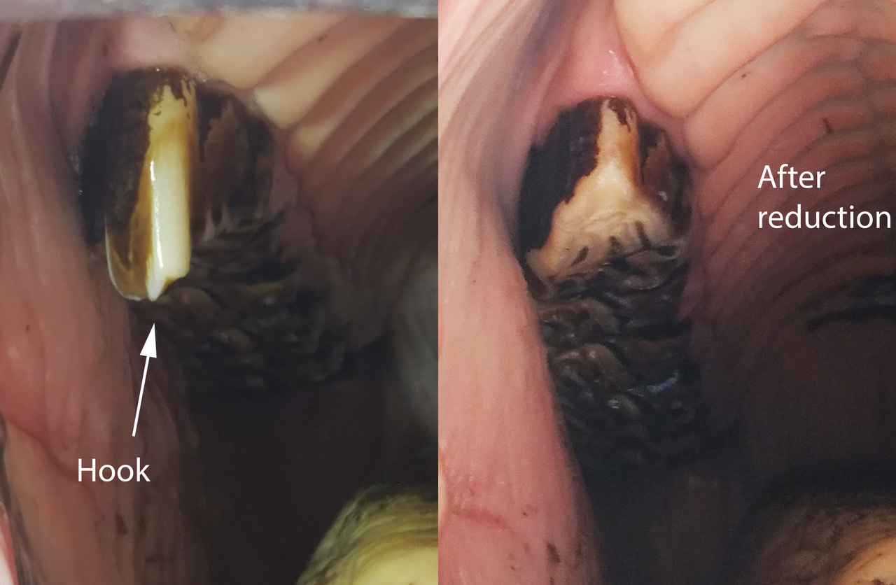 When things don’t line up properly, the wear patterns can be even more dramatic, causing malocclusions. “When all the upper maxillary cheek teeth arcades aren’t in alignment with all the lower mandibular cheek teeth, it can lead to part of a tooth not having an opposing tooth to grind against, and therefore the tooth will keep erupting and develop overgrowths.” An example of this is what is known as “parrot mouth.”