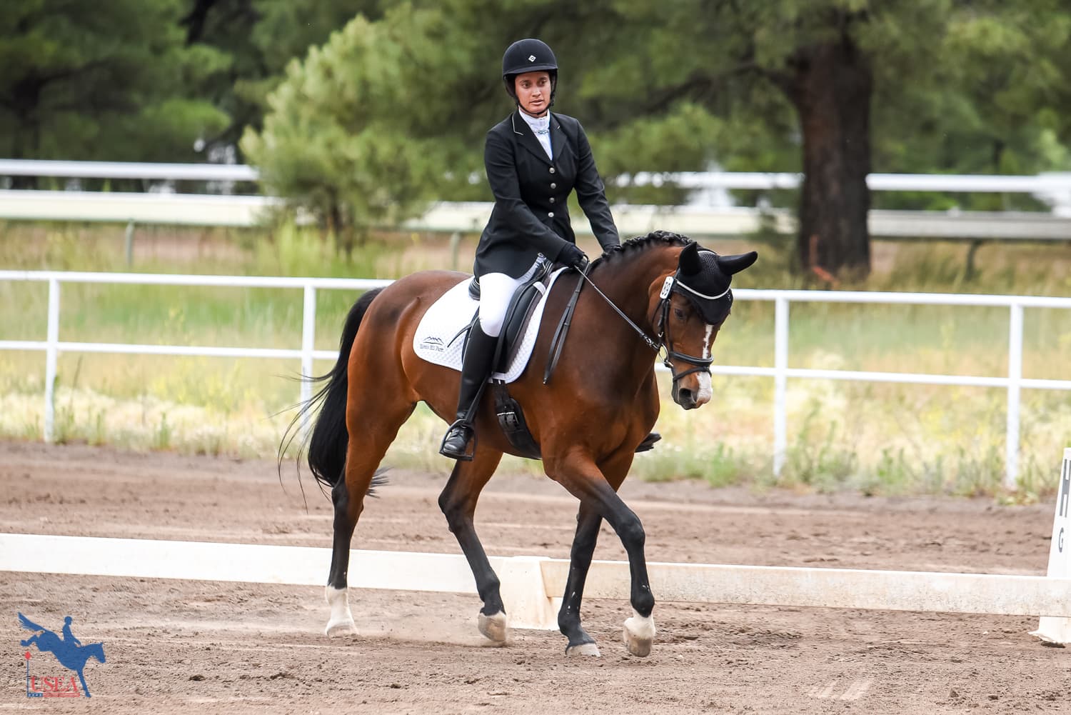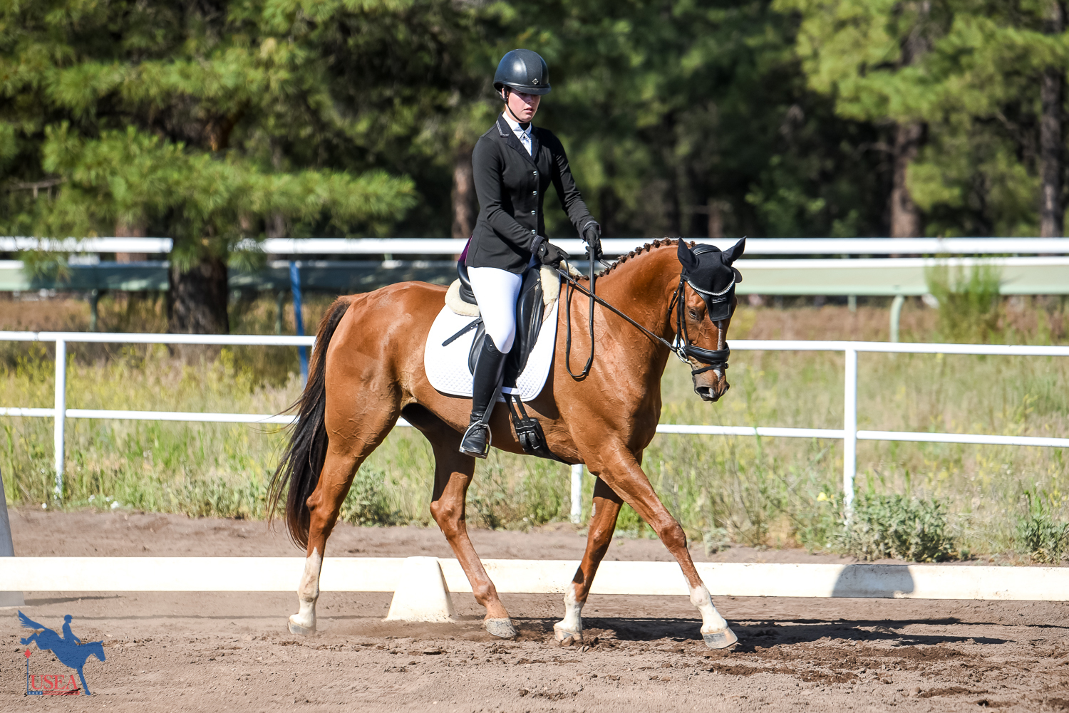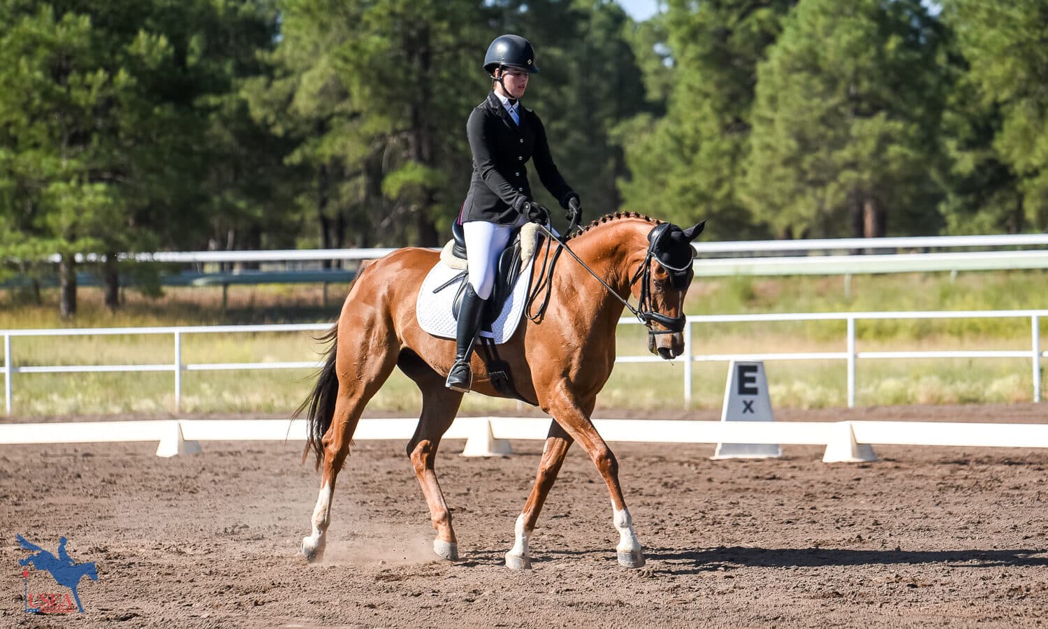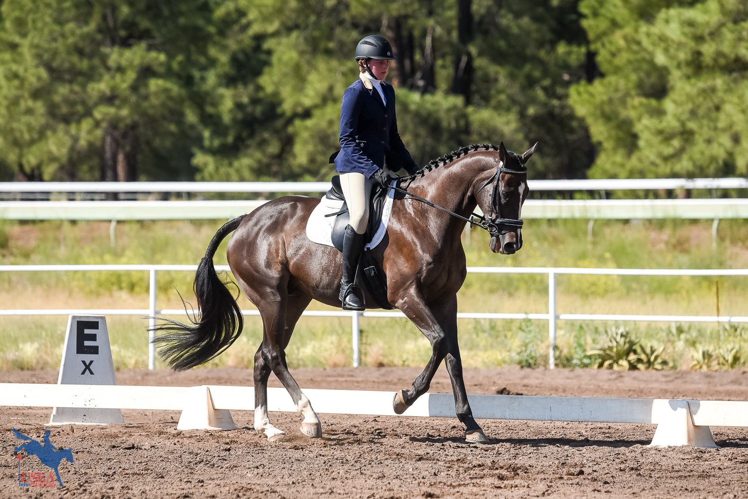 Bonnaure and Texas Red are coming off a win in the Training division at the Coconino Summer I Horse Trials last week, and Bonnaure shared that having time to settle in to the venue has helped with “Red’s” nerves. “He’s a super anxious horse typically at shows but since he’s been here a while, he’s pretty relaxed,” Bonnaure explained. “He came out this morning and he was a bit spooky and acting kind of stupid, so I had a super long warmup and just got him practicing all the movements in my test. I went into the ring and I didn’t quite get my trot before I went in for my test so I went in a bit ‘go, go, go’ and down the centerline just made sure I got him in a big going trot and from there he softened up and went really, really well.”