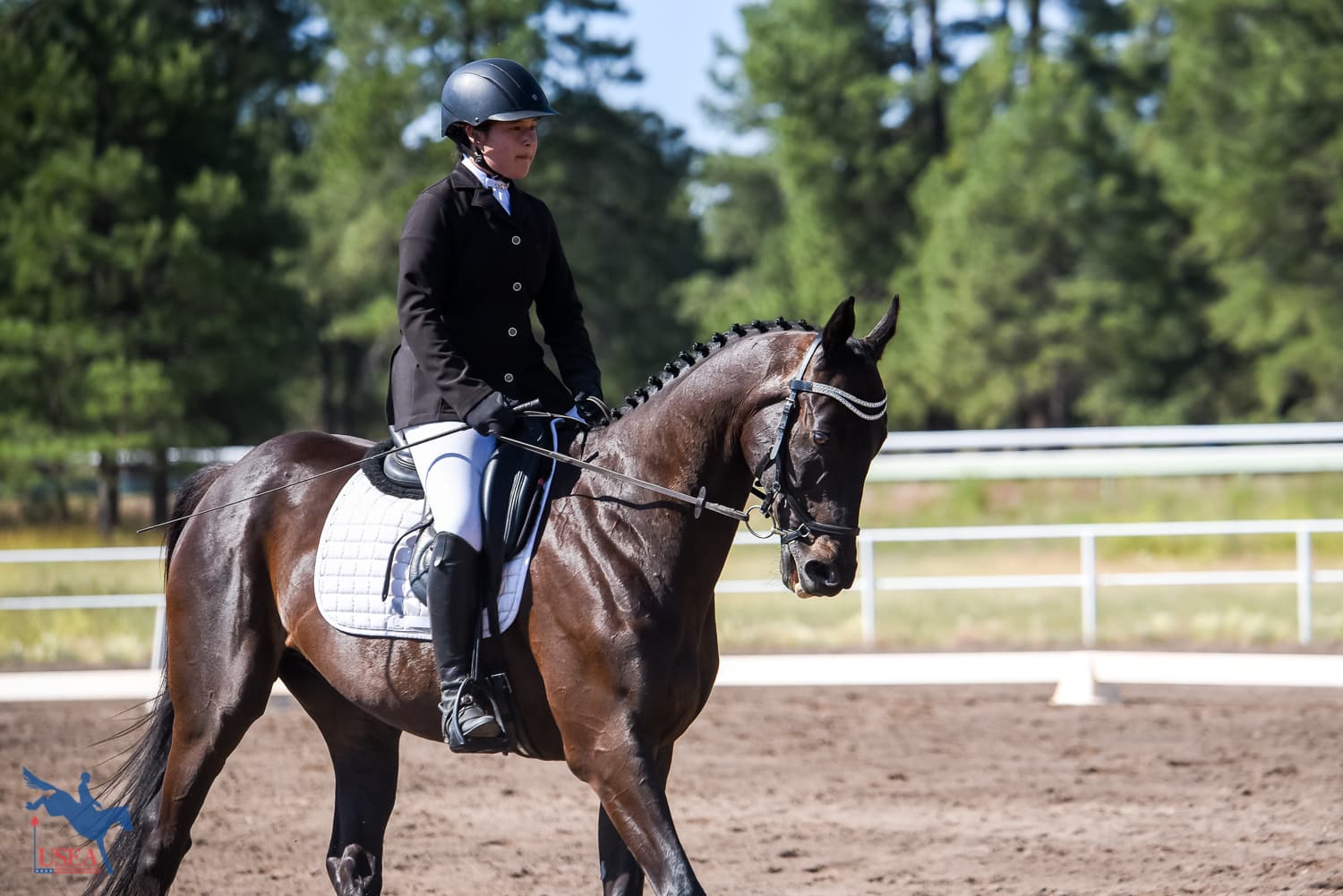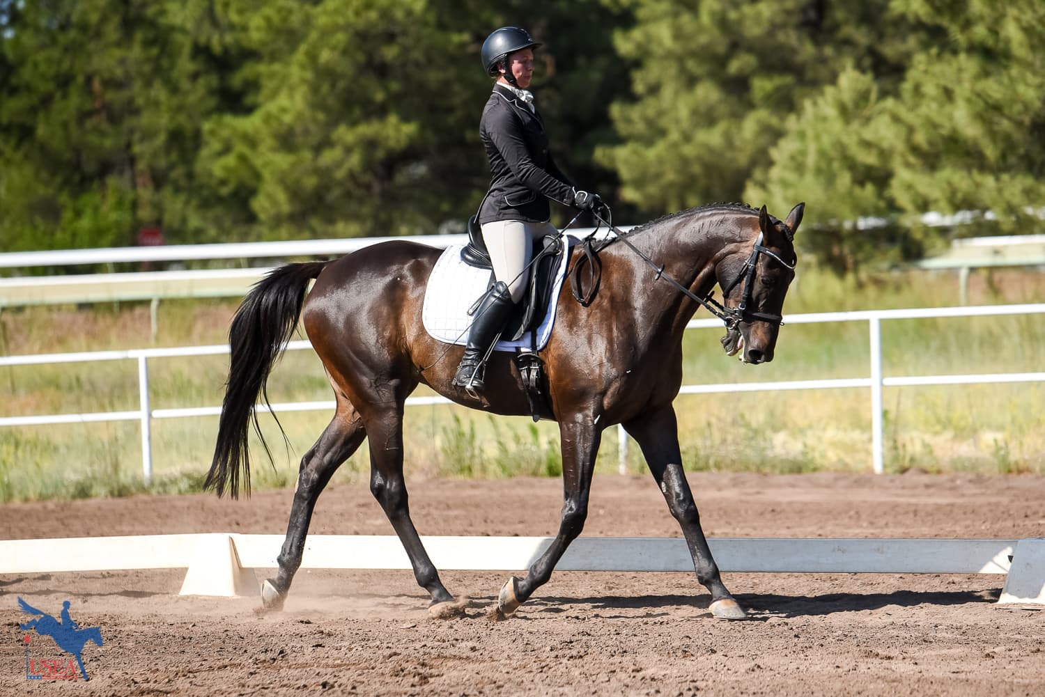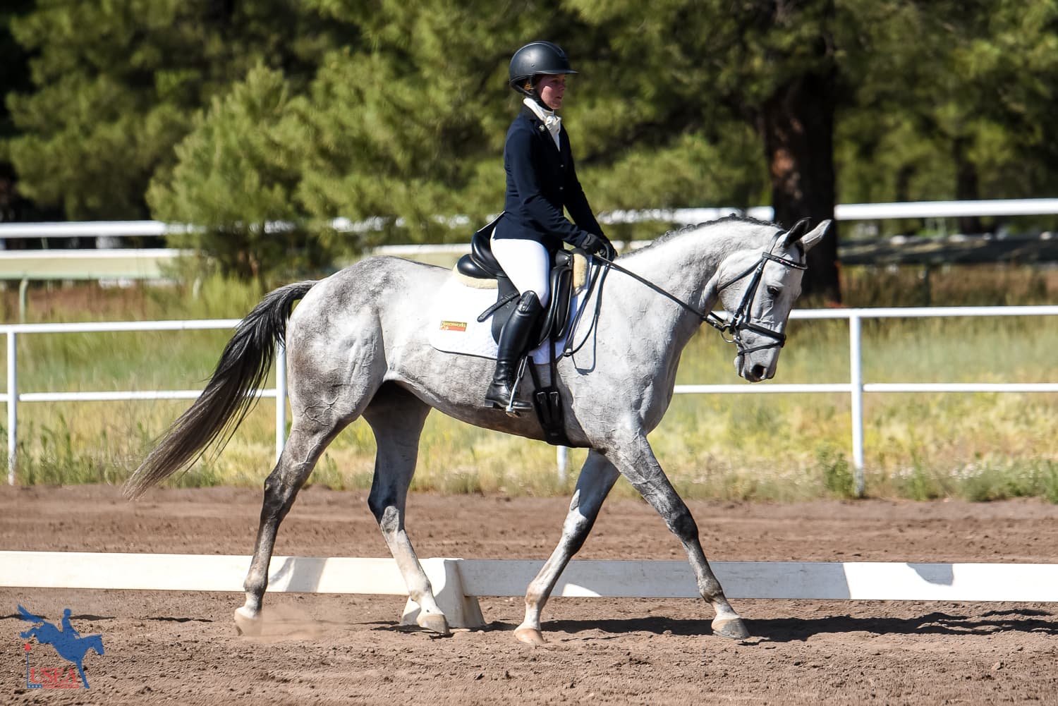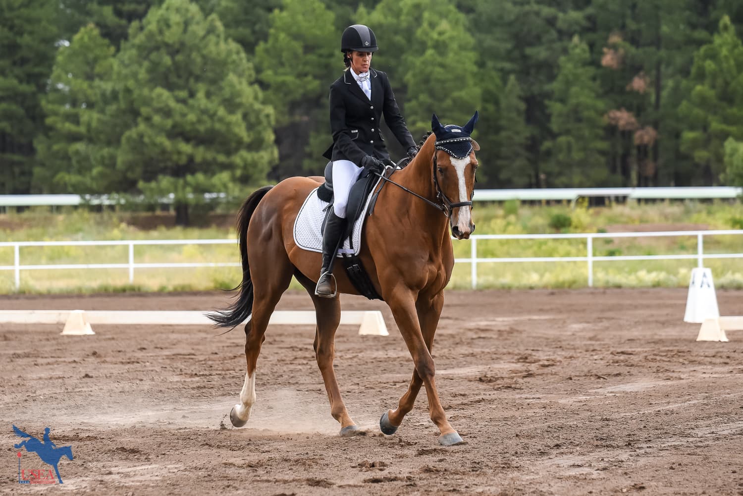 Bonnaure and Texas Red are coming off a win in the Training division at the Coconino Summer I Horse Trials last week, and Bonnaure shared that having time to settle in to the venue has helped with “Red’s” nerves. “He’s a super anxious horse typically at shows but since he’s been here a while, he’s pretty relaxed,” Bonnaure explained. “He came out this morning and he was a bit spooky and acting kind of stupid, so I had a super long warmup and just got him practicing all the movements in my test. I went into the ring and I didn’t quite get my trot before I went in for my test so I went in a bit ‘go, go, go’ and down the centerline just made sure I got him in a big going trot and from there he softened up and went really, really well.”