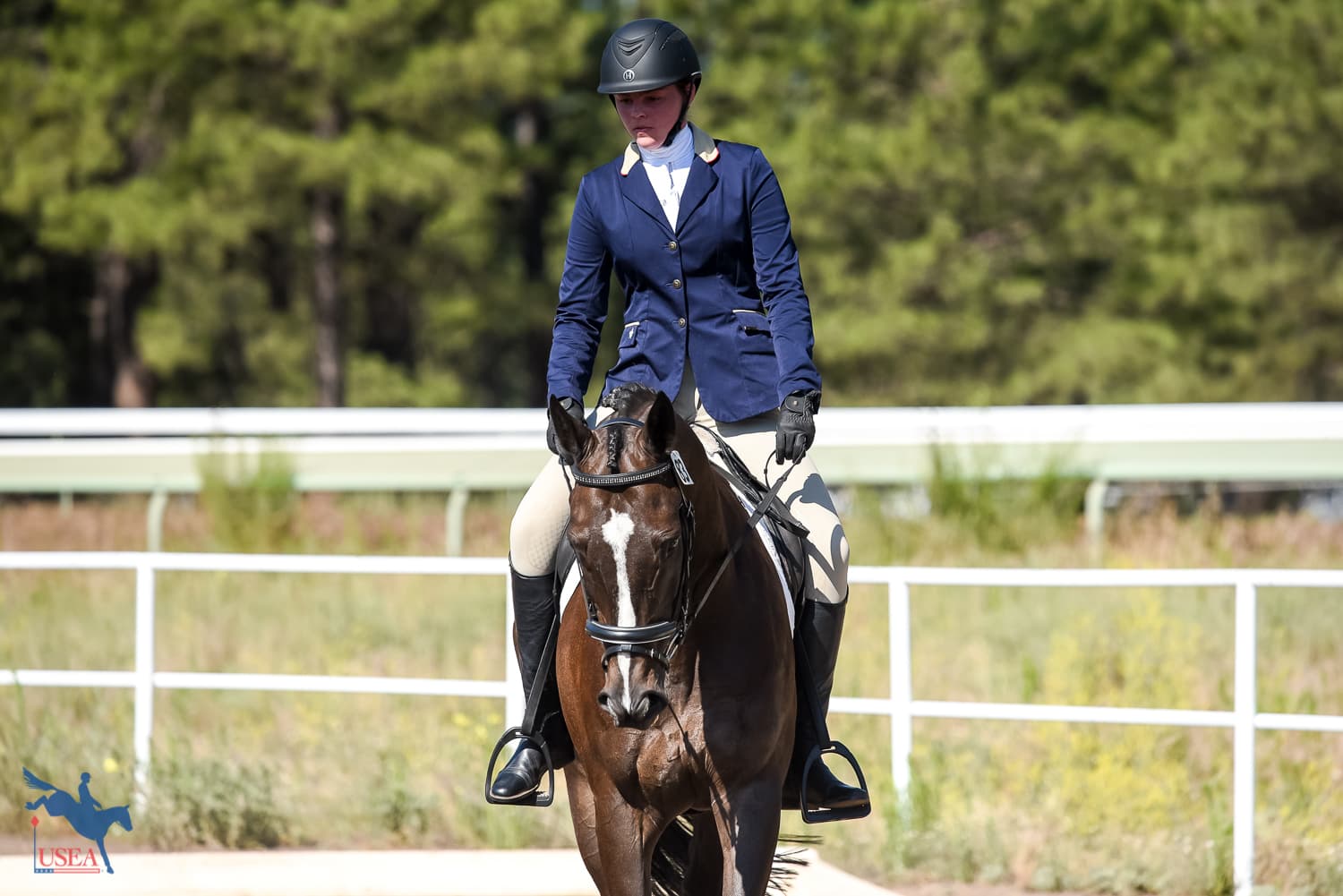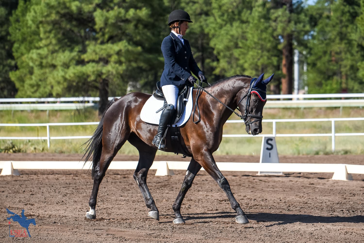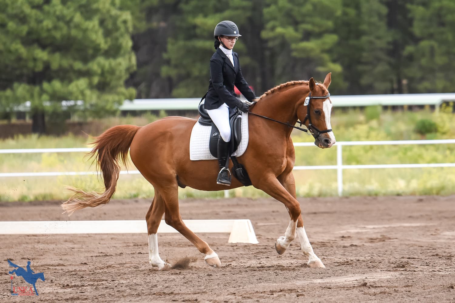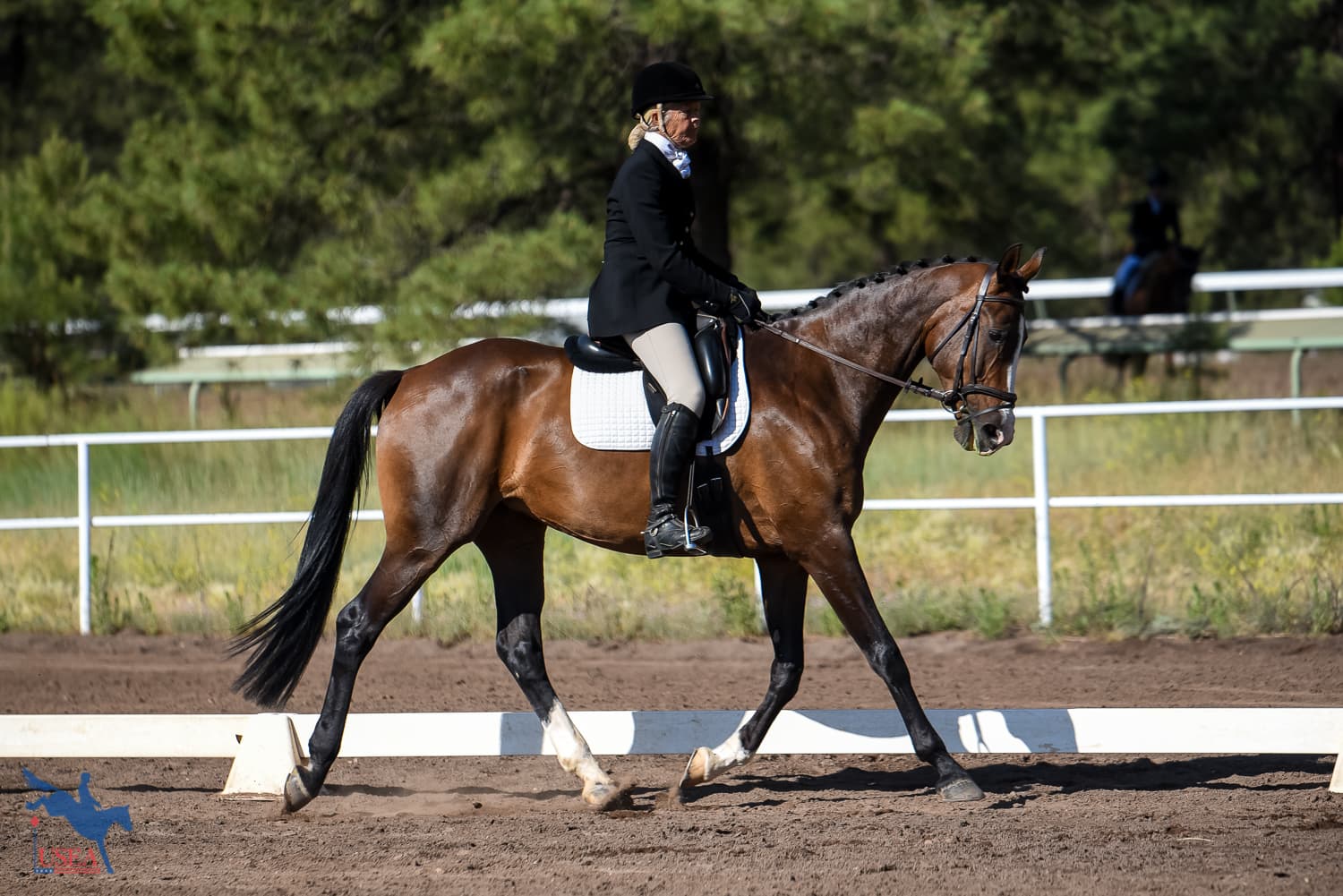 Bonnaure and Texas Red are coming off a win in the Training division at the Coconino Summer I Horse Trials last week, and Bonnaure shared that having time to settle in to the venue has helped with “Red’s” nerves. “He’s a super anxious horse typically at shows but since he’s been here a while, he’s pretty relaxed,” Bonnaure explained. “He came out this morning and he was a bit spooky and acting kind of stupid, so I had a super long warmup and just got him practicing all the movements in my test. I went into the ring and I didn’t quite get my trot before I went in for my test so I went in a bit ‘go, go, go’ and down the centerline just made sure I got him in a big going trot and from there he softened up and went really, really well.”