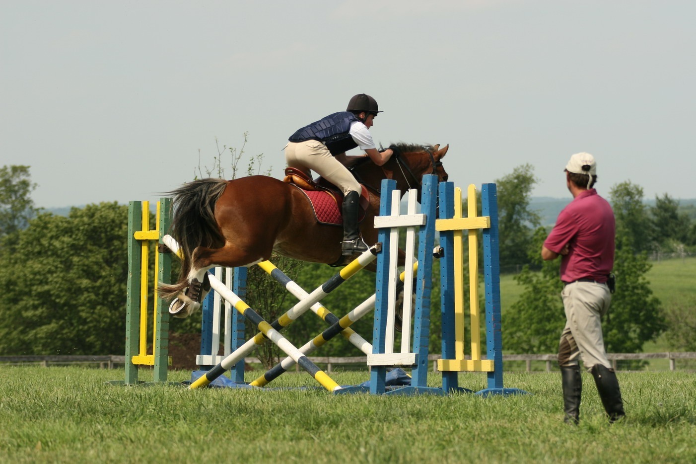 (Gunther, aboard his draft-cross, is coached by Dutton during a jumping lesson.)