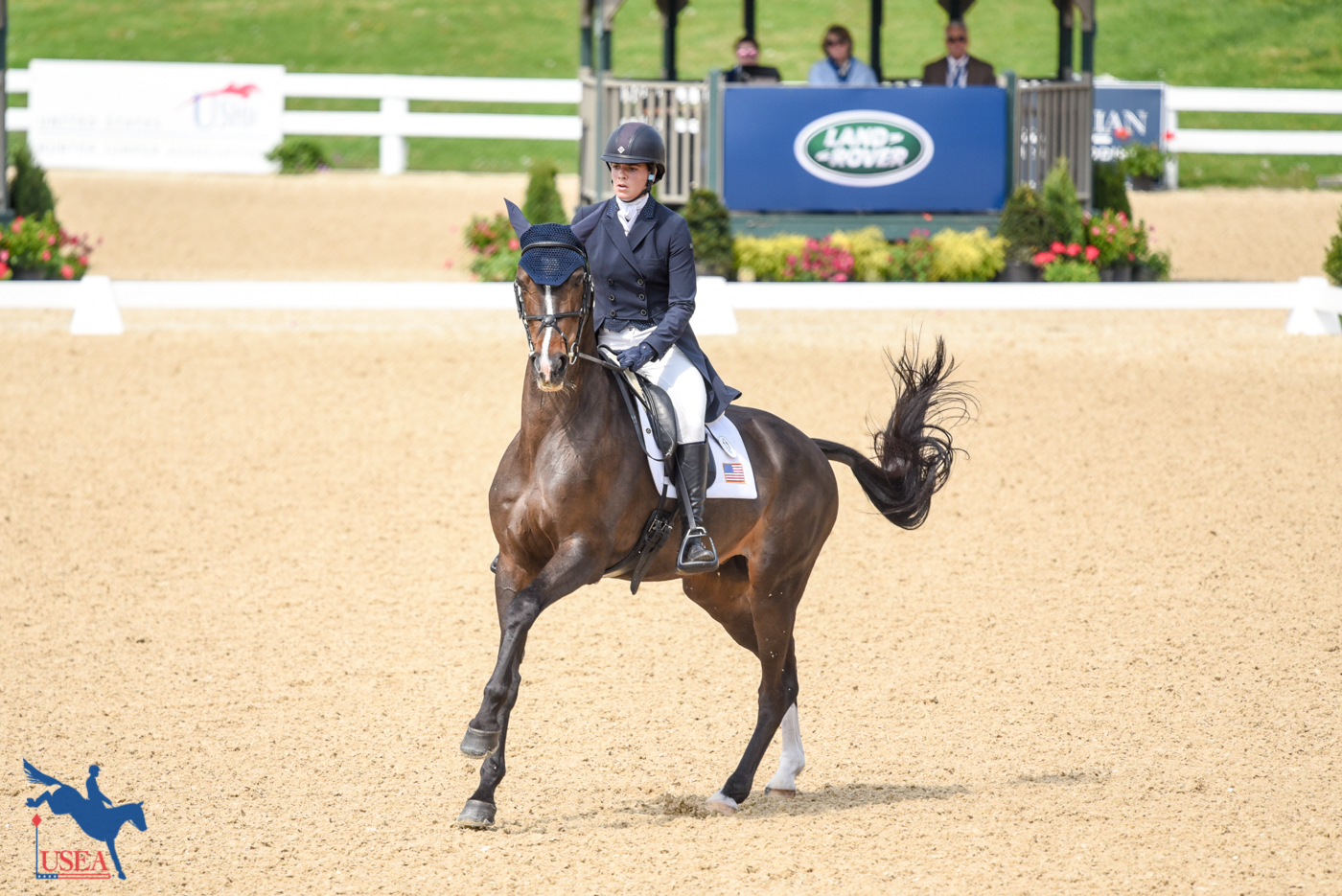 Ten horses entered the Rolex arena after the lunch break at the Land Rover Kentucky Three-Day Event, and only one was able to break into the top five - the final pair of the day Buck Davidson and Jak My Style - sliding into fifth place on a 34.1. The top four remain the same as this morning with Felix Vogg leading, followed by Elisabeth Halliday-Sharp, Buck Davidson, and then Hallie Coon.