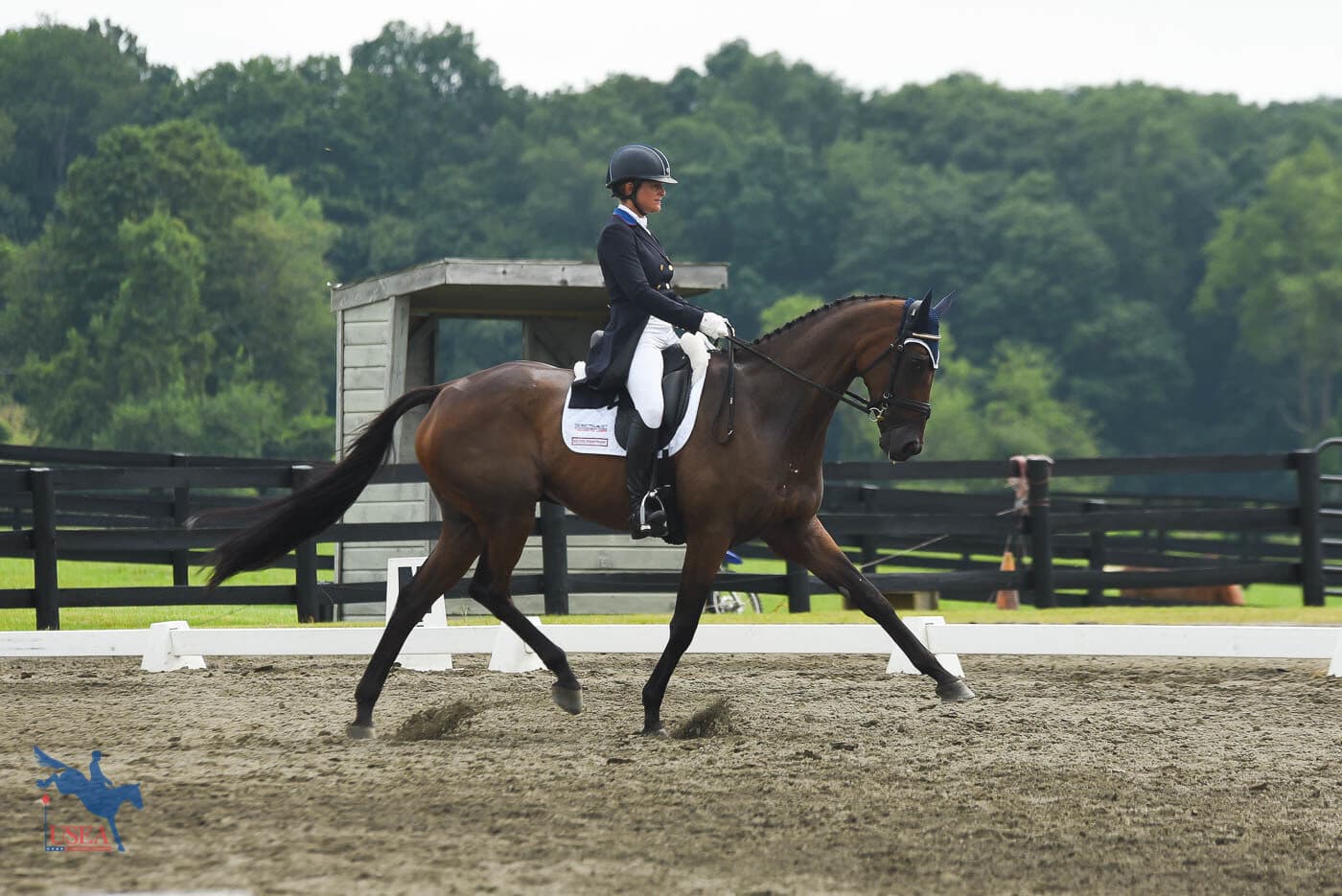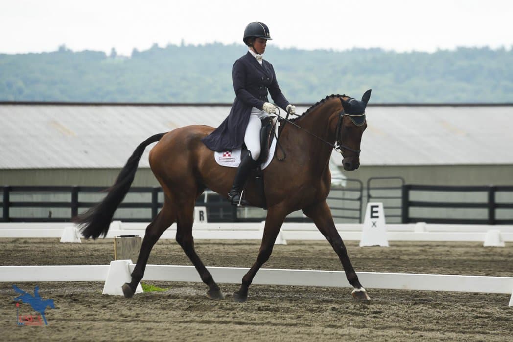 “It wasn’t one of his best tests, honestly. He was a bit tense,” said Symansky of her test with the 14-year-old off-the-track Thoroughbred gelding. “It was a bit quiet there this morning and he could really see the all the cross-country going on anytime he’d be going back towards “A,” so I thought he was a little more holding than normal, but he’s gotten so reliable in the ring that even on one of not his best days he still does well. Even when he’s nervous you can rely on him, which is really nice.”
