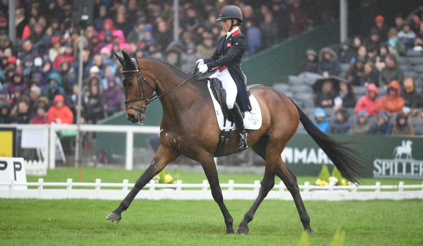 South Gloucestershire, England—May 6—Rosalind Canter and her hugely popular horse Lordships Graffalo lit up a damp Coronation Day when producing a superb dressage test to take the lead at Badminton Horse Trials.