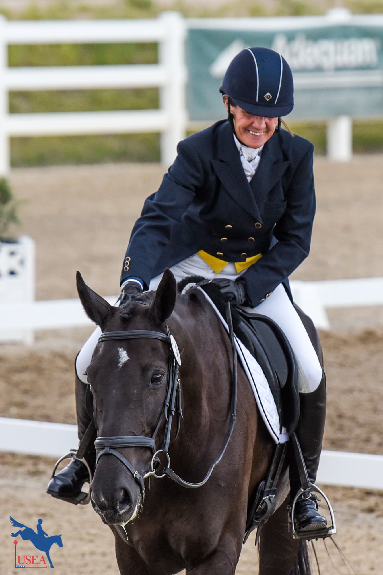 “He was completely wild today,” Smith confided. “Well, he likes to run and jump!” Eric Markell chimed in. “He smiles when he runs cross-country.” Smith continued, saying, “I wasn’t sure what he was going to do in the ring and he was strong, not listening to my half-halts and flinging his legs. I think he was very happy to be on a stage like that. I picked up the canter and went around the ring and I couldn’t help but smile. He’s so special and he’s such a showman, it’s really fun. It’s hilarious when he’s naughty because it’s not often that he’s naughty. In my test I was doing my half-pass and then I went to go forward to do my change and he leapt in the air, kicked my right foot, and then bolted. And right after that came my stretchy circle so I didn’t even start it until it was too late. It was fun, but he was wild.” Markell commented that, “When I was leaving I heard one man say to another, ‘That horse comes in the ring and takes it over with his personality.’”