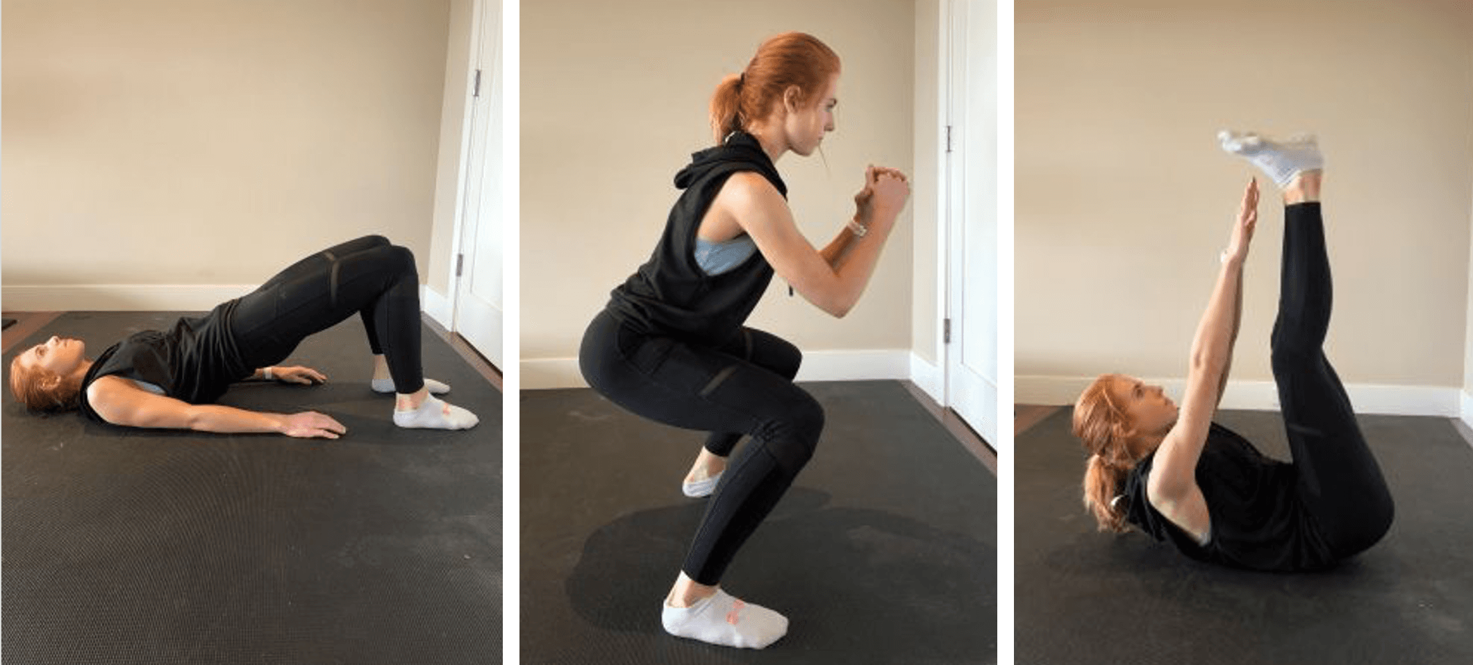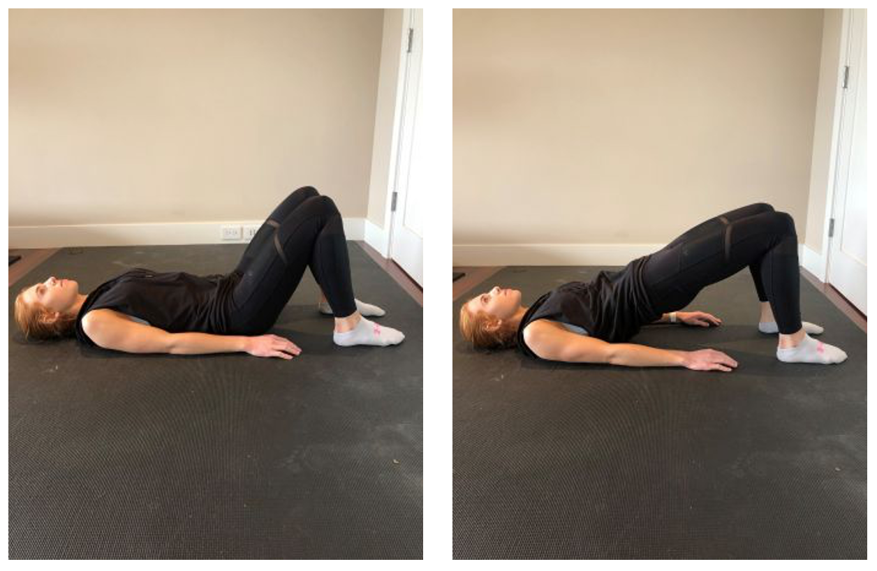 Lie on your back with your knees bent. Raise and lower your hips, squeezing your glutes at the top. For a challenge, add a weight (a heavy book would do), or hold the bridge at the top for five seconds.