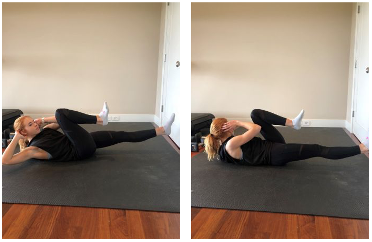 Lie on your back with your legs lifted at 90 degrees above you and your hands cradling your head. Straighten one leg at a time and push your opposite elbow across and towards the leg that is being straightened. Do these slowly and focus on stabilizing through your core