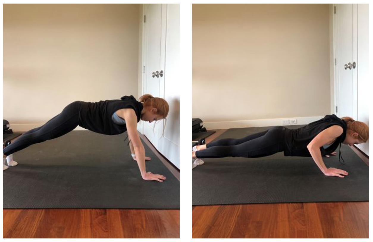 Any variation of push-up will work. Remember that it is most important to exhibit good form, with your shoulders and butt aligned and your core tight. If this is impossible to do in typical push-up form, drop down to your knees. Make sure to lower yourself down until you have created a 90-degree angle through your elbow.