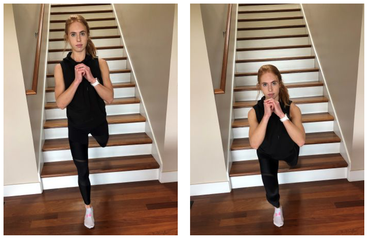 Find a step or chair to place one of your feet (object should be just about knee height). Then with that foot elevated, take a big step forward with your other foot. Squat up and down with the leg in front, lowering as deep into that squat as possible. Grab another chair or object to hold onto for balance if needed. For a challenge, add weight. Repeat on each leg.