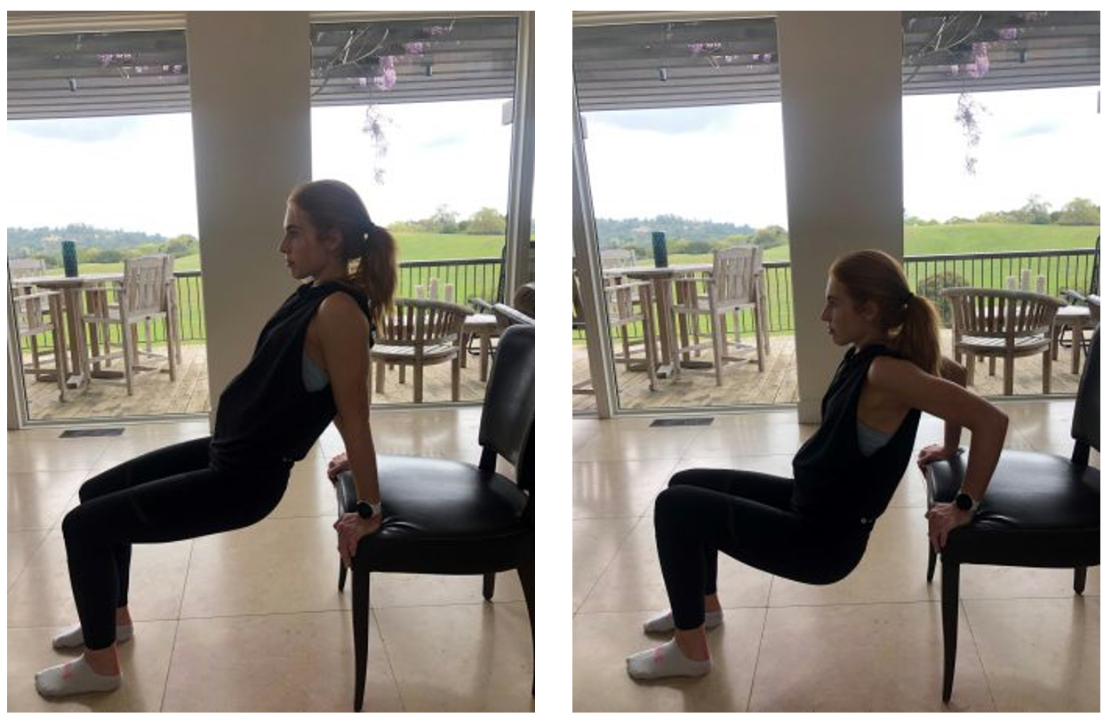 Use a chair or a low-standing table and sit on the ground facing away from it. Place your hands on a chair (while you are still facing away) and raise yourself up and down. The distance your feet are from the object will determine how much weight you are placing on your triceps. Remember to keep your glutes and core tight!