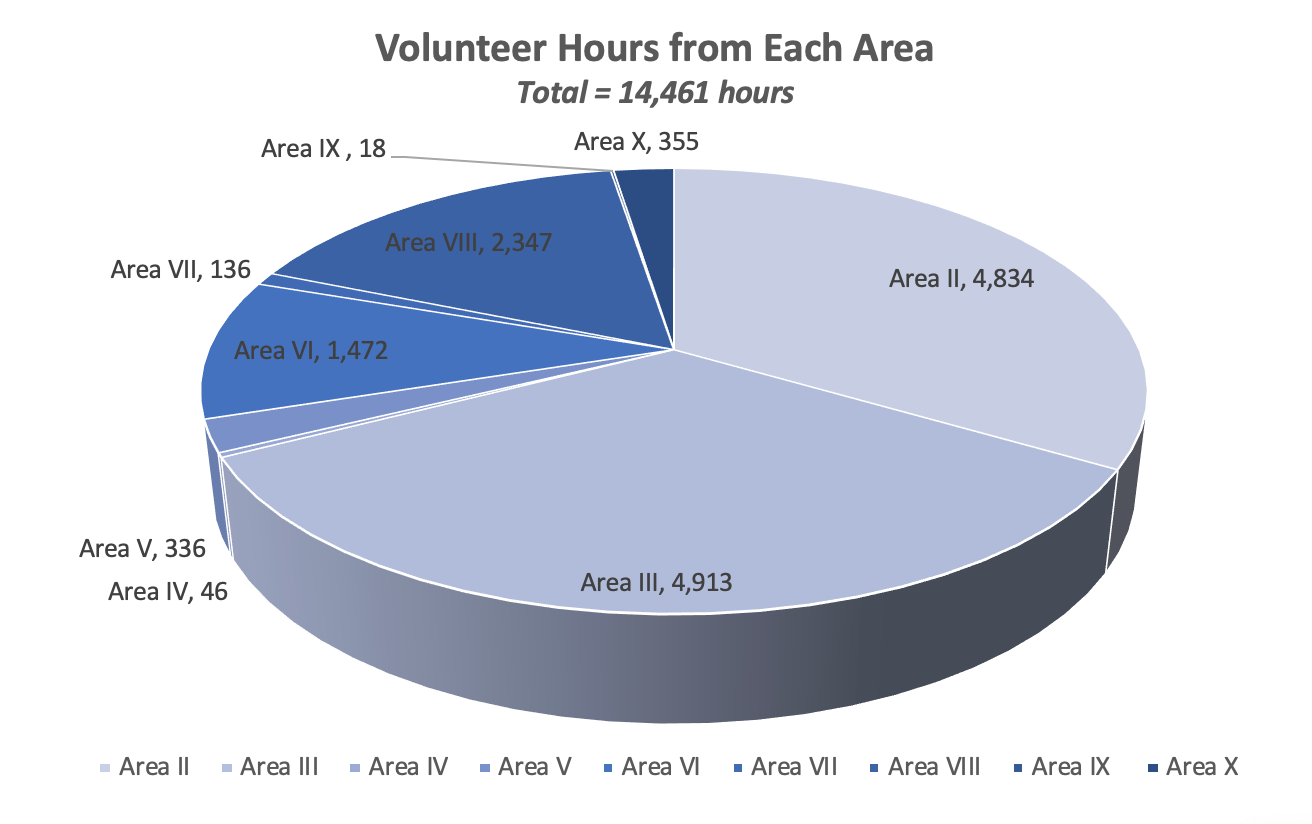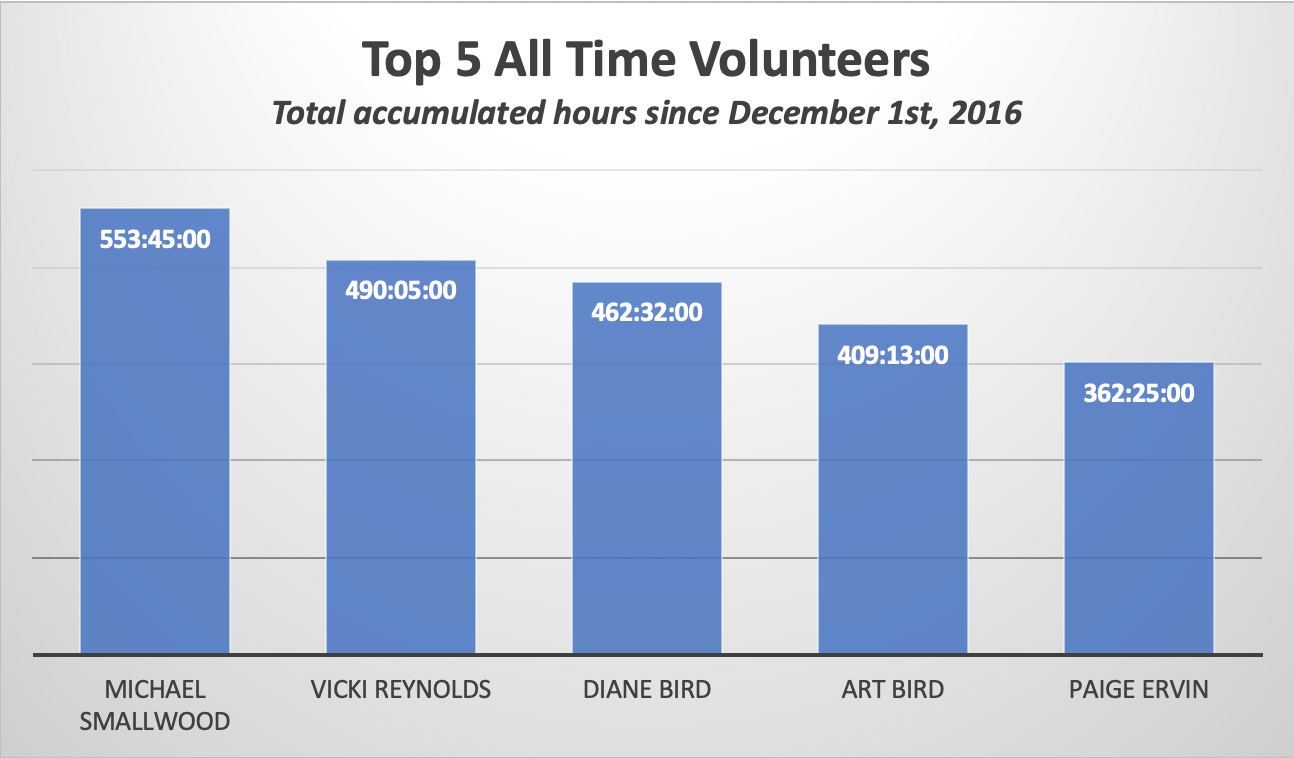 She once topped the 2018 national volunteer leaderboard and now she’s currently on top of the 2019 national volunteer leaderboard, Vicki Reynolds from North Carolina has a total of 159 hours and 40 minutes for 2019. Right behind her is Cindy Jezerski from Florida with 146 hours and 50 minutes. Rounding out the top three is Diane Bird from South Carolina with 145 hours and 25 minutes.