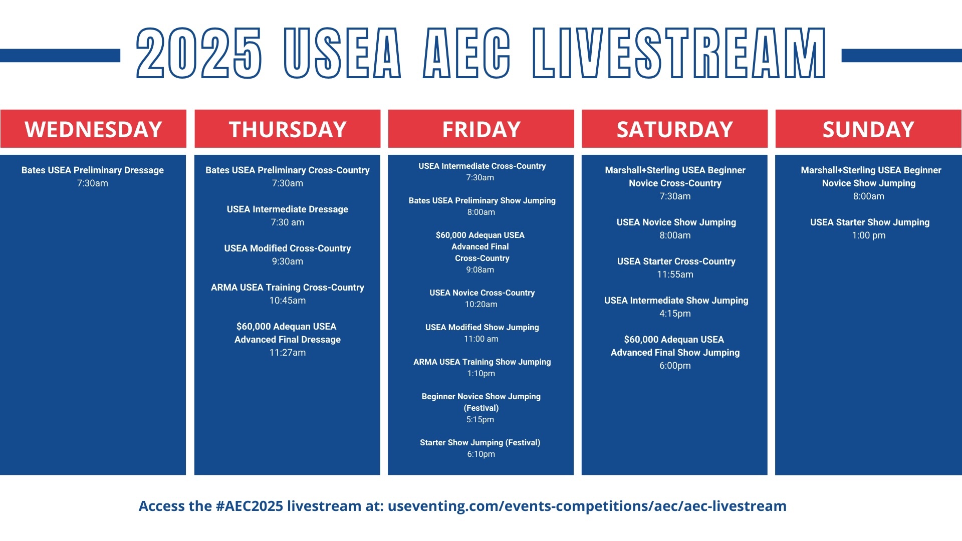 Horse & Country has joined forces with Equine Network to co-live stream the 2025 AEC. Eventing fans will be able to watch the action both live and on-demand completely free on H&C’s streaming service, H&C+, as well as on EN’s platform, EQUESTRIAN+. The dressage, cross-country, and show jumping phases of the $60,000 Adequan USEA Advanced Final will be shown in full, and there will be extensive coverage from other levels including all of the cross-country and the top 10 show jumping rounds from every division. Competitors can purchase their videos here.