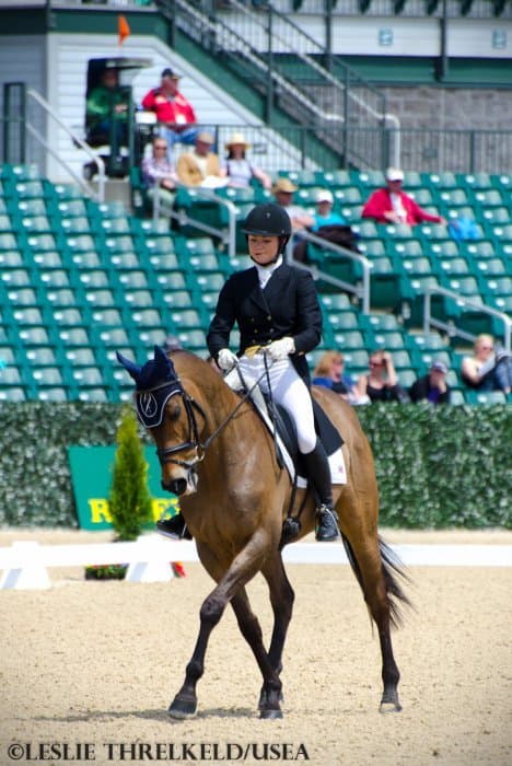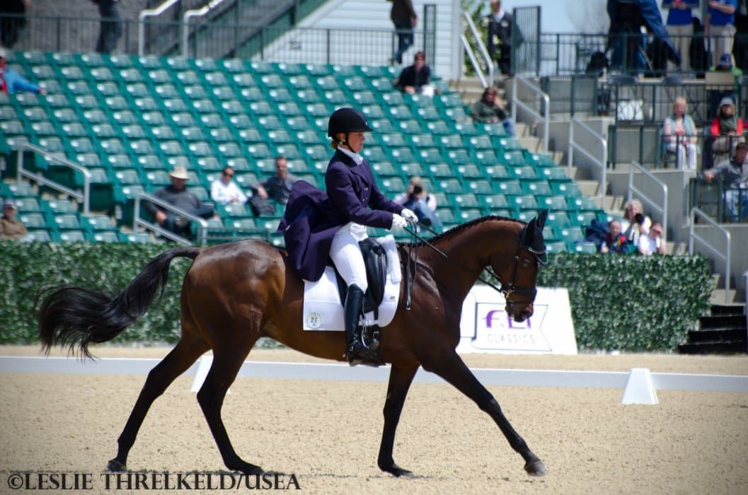 “He is a lazy horse and he knows when I drop my whip, so I did it at the last possible second,” said Faudree, as whips are not permitted in the dressage portion at this level. “I have to flail around on him to keep him going. I have to do a lot of trot-to-walk transitions to get him hot and in front of my leg.”
