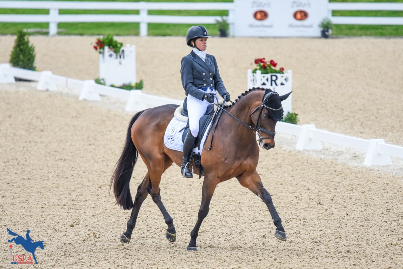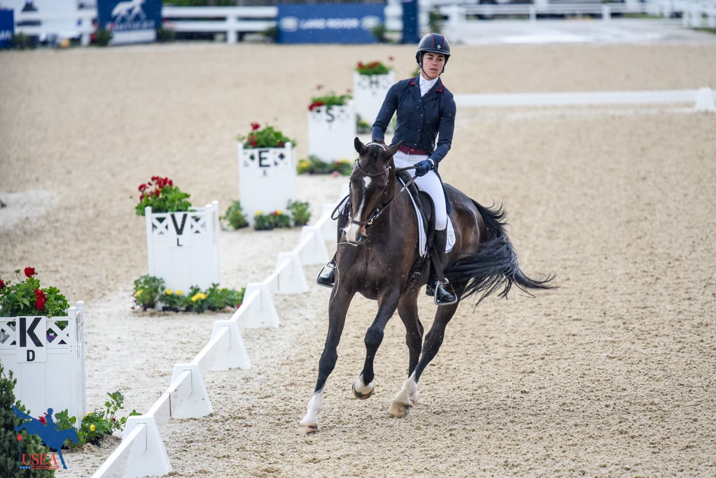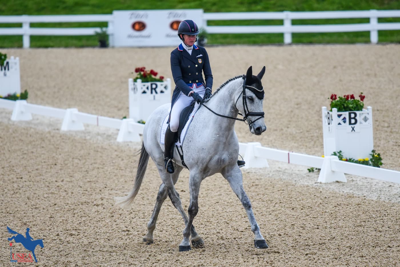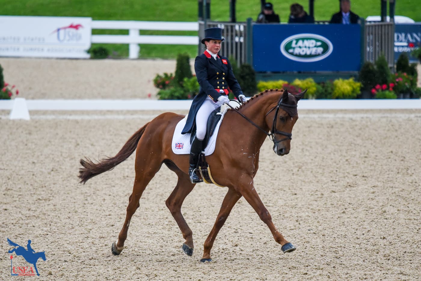 Piggy French stole the morning show by knocking overnight leader Felix Vogg out of the top spot, and she now sits in second place heading into tomorrow’s cross-country phase. French is on her FEI World Equestrian Games gold medal team mount, Quarrycrest Echo (Clover Echo x Royal China) and was proud of her partner today. “I was delighted. The warmup this morning in the monsoon first thing was interesting. He went back in his stable for an hour, and when we came back out it was cold and stormy. He started spooking, which he hasn’t done all week, but he felt tight and spooky in our warmup. I’m delighted with him from how he was in the warmup to go in there and be a professional and do his job. I was proud of him on how he did his best work of the morning in the arena.”