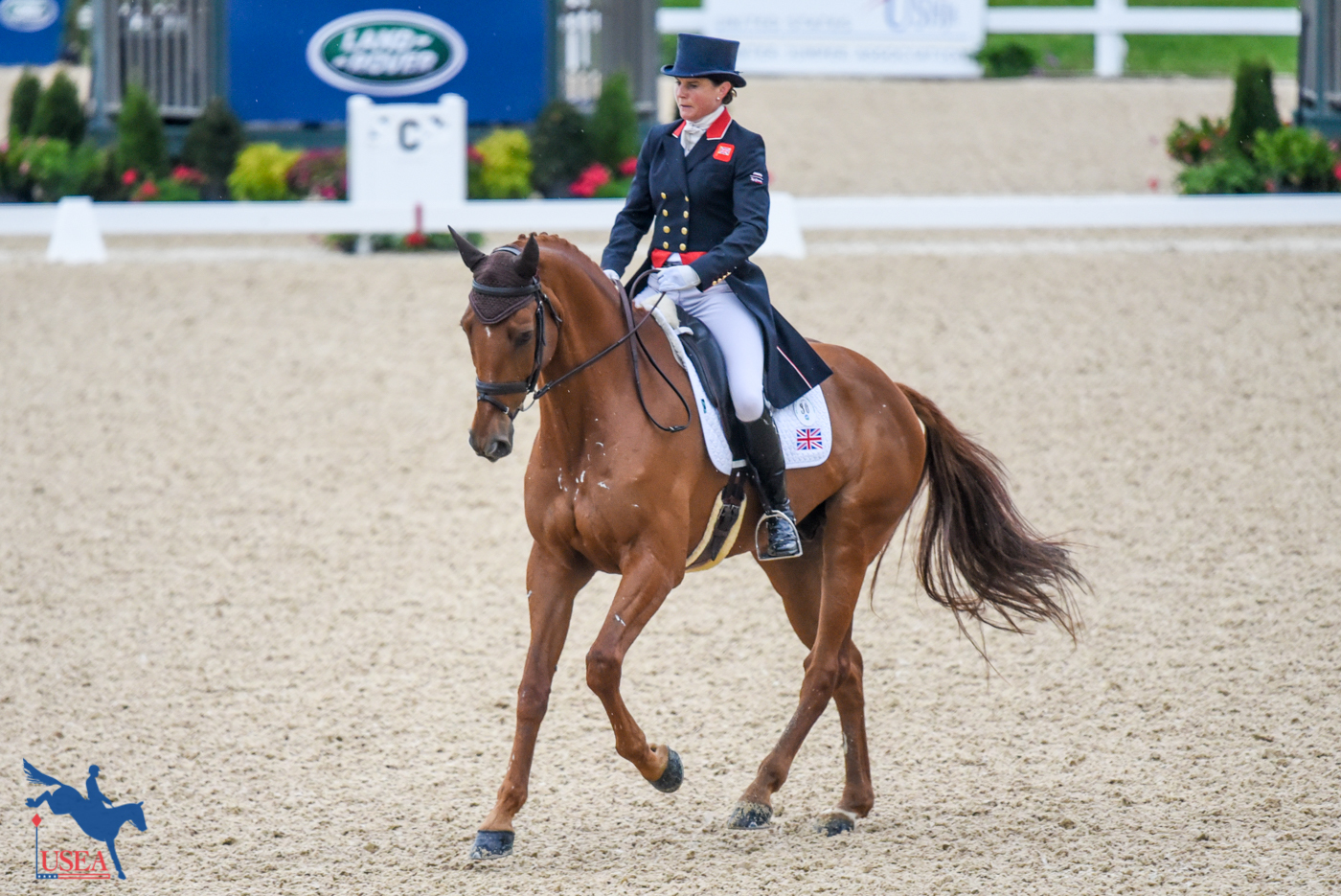 While Great Britain owns the top two positions after dressage, the United States has Boyd Martin sitting nicely in third. “I was happy with my bloke. He put in a good test” Martin said of Christine Turner’s 12-year-old Trekehner gelding, Tsetserleg (Windfall x Thabana). “Dressage is a frustrating sport because you always look back and wish you had done one part or another better. This year, [Tsetserleg] is a bit more seasoned and confirmed at this level, and he’s been working really, really well. I think this is our third year together and it takes about two years to form a good partnership. Last year was a bit of a rush going to the WEG I think, and it’s been good just taking a bit of a moment to get to know each other. He’s a little bit of a quirky horse, and we’ve had time now to figure each other out.”