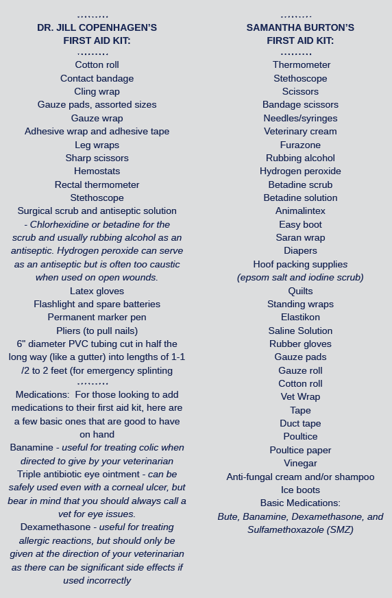 While having a basic first aid kit is necessary for every barn, several items can be deemed more essential than others. Thermometers, antiseptic solution, wraps, scissors, and basic medications are items that overlap in both Copenhagen and Burton’s first aid kits.
