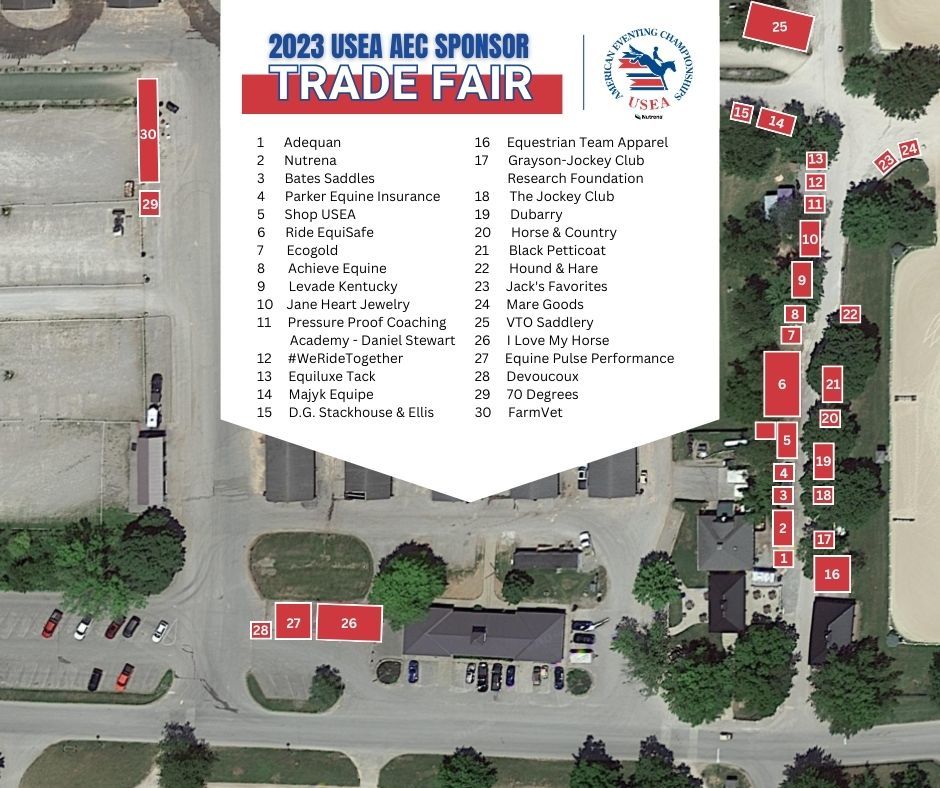Visit the AEC Sponsor Trade Fair from 8:00 a.m. to 5:00 p.m. Tuesday through Sunday to browse through 30 shops and boutiques that offer horse tack, equestrian apparel, food, and more, including the Shop USEA booth where you can grab exclusive AEC gear. View the map below to start making your shopping list, and click here for more information.