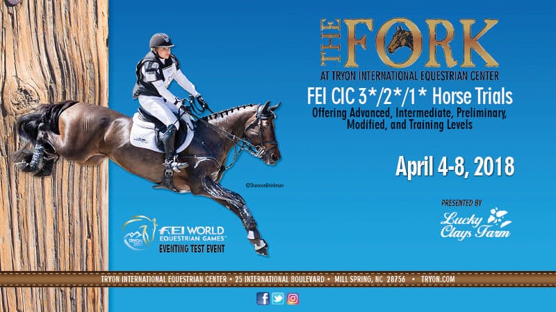 Tryon International Equestrian Center (TIEC) is proud to announce the return of The Fork at TIEC, the FEI CIC 3*/2*/1* and Horse Trials presented by Lucky Clays Farm, on April 4-8, 2018. The CIC3* division of The Fork competition will also serve as the Eventing Test Event in preparation for the FEI World Equestrian Games™ Tryon 2018 (WEG) in September. General admission and parking are free for all competitions and additional ticketed spectator events will be hosted throughout the week.