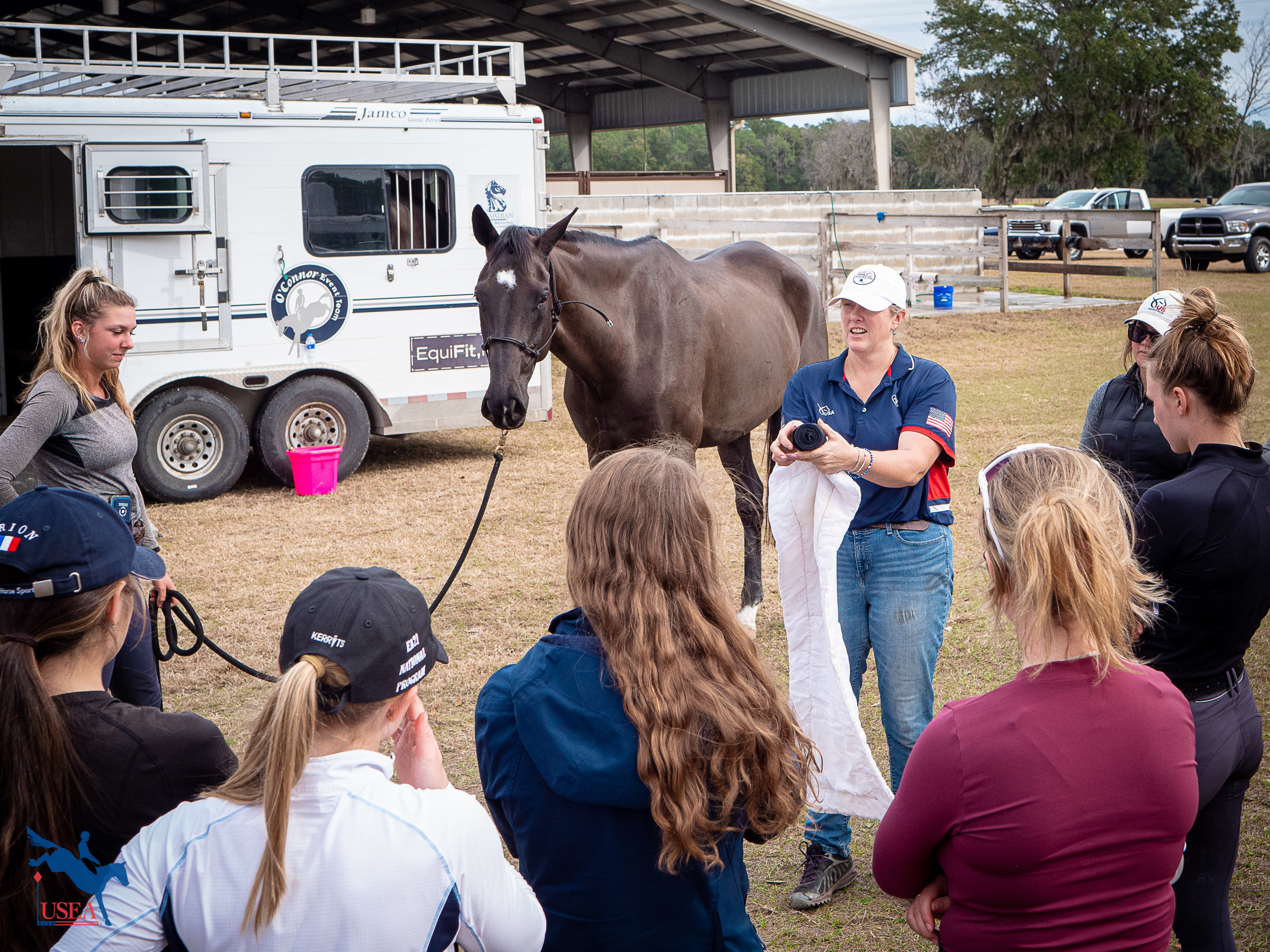 At the conclusion of the riding session, professional groom Emma Ford continued her discussion on maintaining the health and well-being of their horses. Ford discussed the importance of prevention and journaling horse care to keep track of changes and develop a history that can be referred to at a later date. There was also discussion on maintaining communication with the network of professionals who care for the horse as well as how riders should approach using therapies such as a chiropractor or applying certain solutions to the horse’s legs. The afternoon’s hands-on grooming activity demonstrated the art wrapping of a horse’s legs and the importance of maintaining the horse’s skin. Skin is the largest organ on the horse’s body, and you must keep it stimulated and healthy so they have good health and mobility. Ford suggested using a brush like the posture-prep, and rubbing the skin up and down each day, stimulating the blood cells and keeping the skin moving. A curry may be used as well, and there are techniques to do this in a way that feels like a massage to the horse and can help loosen their muscles and skin at once, helping their overall health.